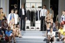 So the model looked tanned, handsome, in great shape and were dressed in tight trousers and unbuttoned shirts. The once ultra ultra low DSquared-jeans appeared with high waist and a flare – so that means you will have to get rid of that belly, boys. Jeans were mixed with (shiny) shirts, blue was the main color besides bright colors like red and green.