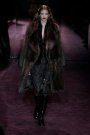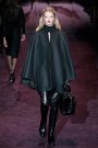 In a palette of purple, navy, forest green, dark brown and black Frida Giannini presented a dark, romantic Gucci collection. She called it modern day romanticism, wit a touch of military, dandy and elegance. There were flat heeled riding boots, wide cut, cropped jackets with gold buttons and softly belted velvet smoking jackets. There was more velvet in the appliqué flowers on translucent chiffon and lace blouses. Skirts had a split in the back, riding trousers flounced wide over each thigh and the full lengtht column dresses were shiny and glittering. Giannini focused on day clothes worn in texturally intense layerings. It sometimes reminded of good old Yves St. Laurent.