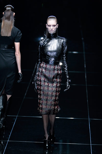 The Gucci-collection for fall 2013 is about smart, wearable, precisely cut style. Designer Frida Giannini went for structured, sculptural lines with pronounced shoulders, either rounded or slightly raised. There were roomy coats and jackets over slim skirts, suits and dresses with body-conscious allure often with V-necklines. This is a powerwoman, especially when she is wearing black (snake) leather. Colors were traditinal autumn-like: moss-green, maroon, russet.