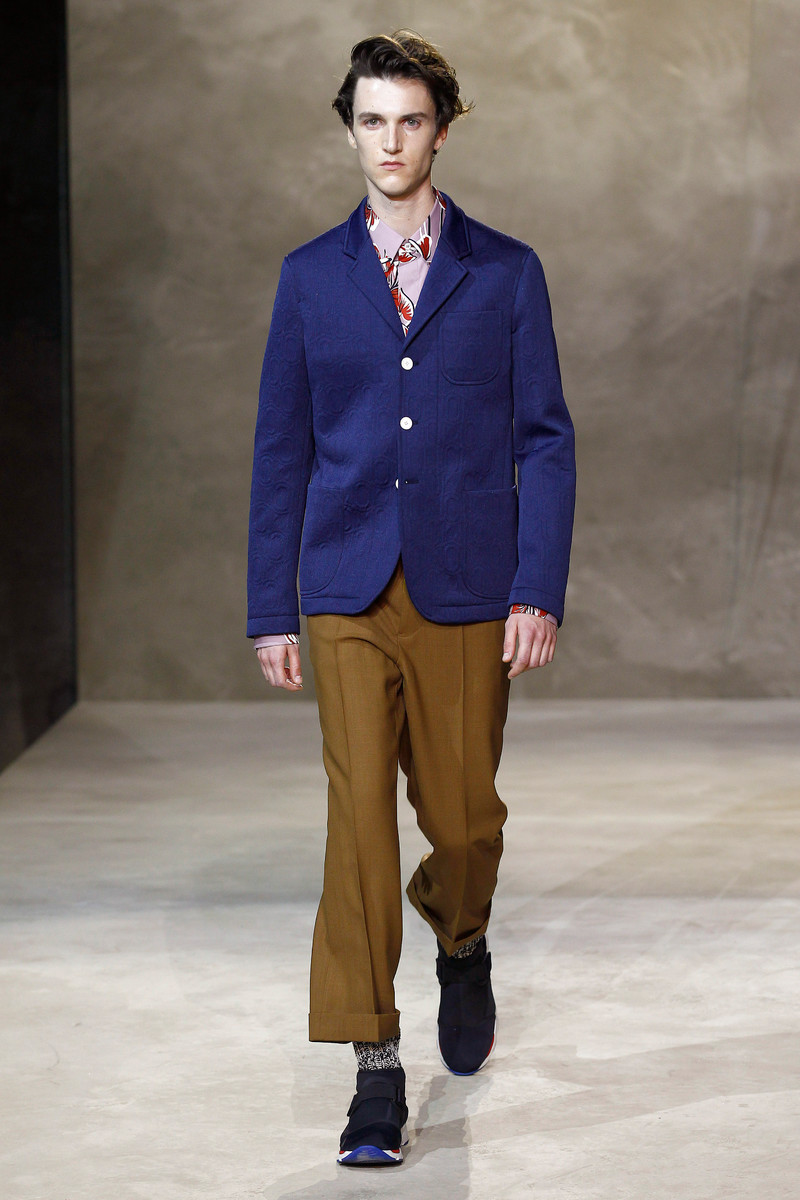 With a Tim Burton-esque soundtrack playing in the backround, Consuelo Castiglioni’s return to the Milan runway with Marni men’s wear captured the awkward juncture between boyhood and the adult world. Outsized collars splayed over leisure suits that could have been nabbed from an uncle’s Seventies vacation wardrobe. Pants, whether loose or slim, were often too short and showed chunky socks and sandals.
