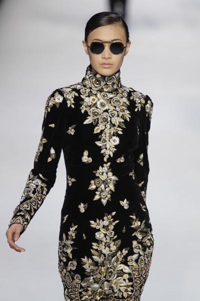 The second half of the collection the corduroy returned in a few tops. It formed a great contrast with the golden lame dresses that quickly followed.
