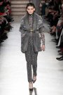 Long, lean silhouettes determined the Missoni fall/winter collection we saw today. And while the looks were very feminine, Angela Missoni added a fresh touch of grunge to her outfits. It was visible through the hair (divided into three parts), the eye catching jewellery (large earrings – in one ear – brooches and matching waist belts) and the odd styling (wrongly buttoned vests).