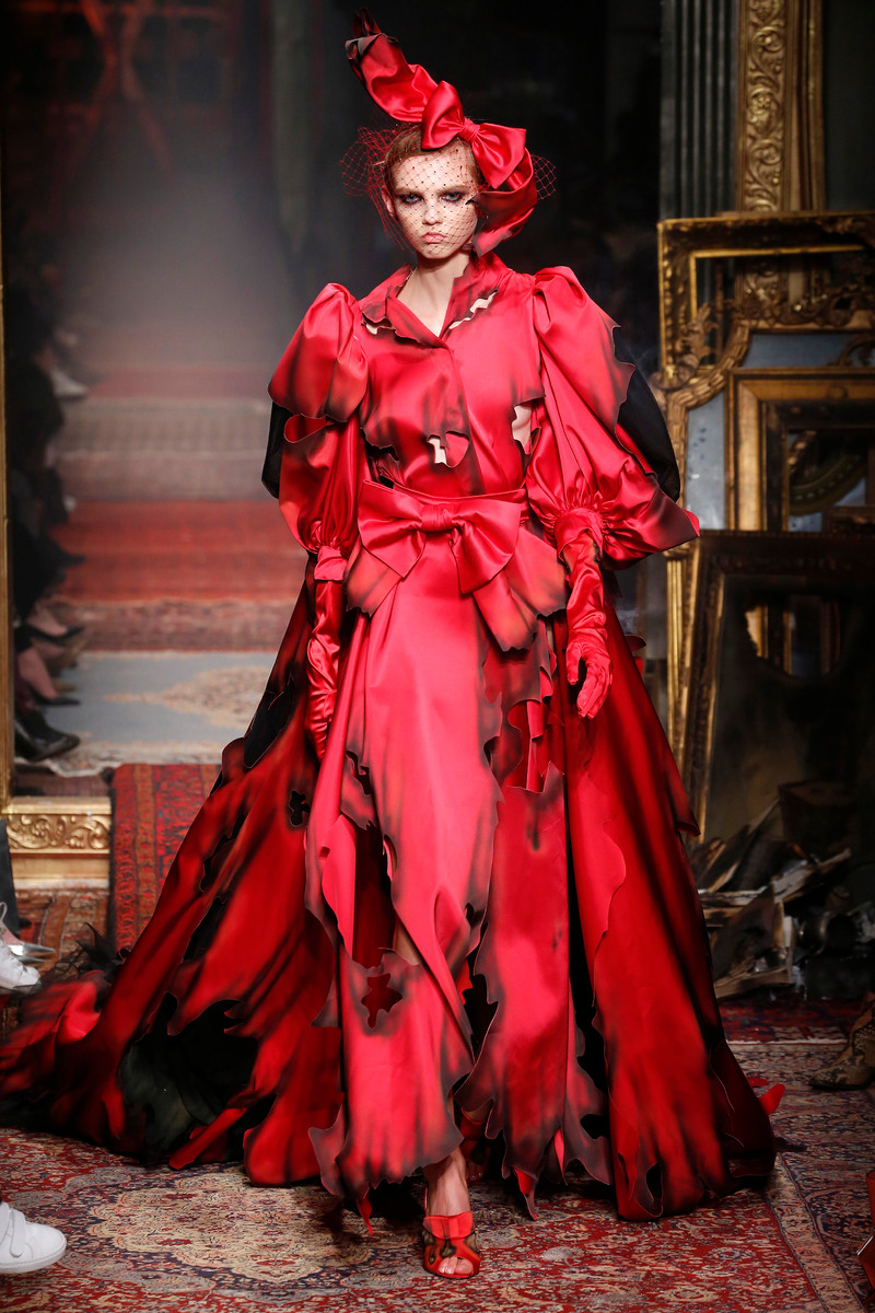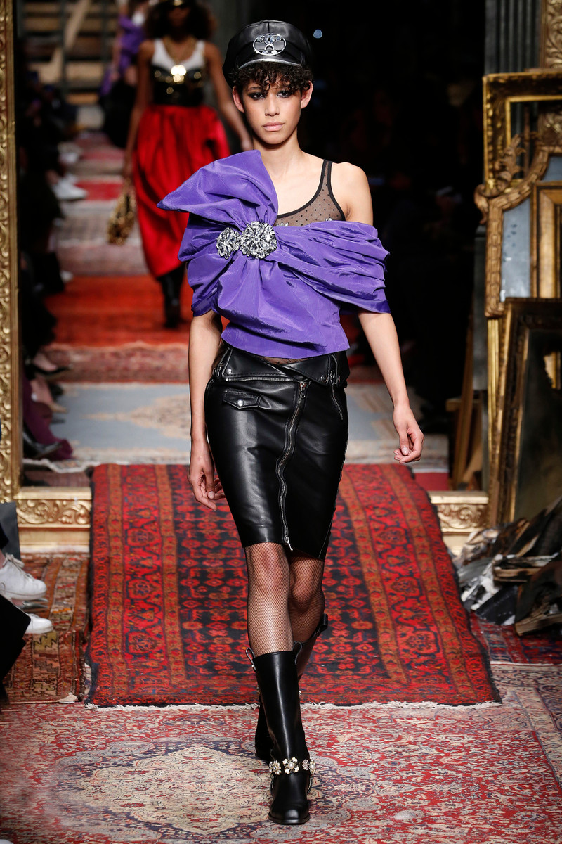 If you were ever wondering if it’s possible to wear a chandelier as a dress? Well, here’s your answer: yes you can. Even better: you áre the chandelier itself. Or follow Sia’s lead, swinging from the chandelier and live like tomorrow doesn’t exist (if you haven’t seen the Carpool session with Sia and James Cordon, please do so as she sings like it’s her last day). And if that was the case (don’t get scared now, it’s just hypothetical), why not dress like if it’s your last day. Make it big, make it bold, make it edgy and never back down, even when everything’s on fire. Picturing the Moschino logo flaming in orange letters, can someone please call 911- the fire department? Jeremy Scott has lit up Milan city. Which he did with giant theatrical dresses with satin bows in purple, yellow and pink fastened with shimmering brooches, strapless ruffle dresses combined with a t-shirt underneath, a black floor-sweeping dress embellished with chains, a pink strapless dress with a leather bodice. If you’re more into playing it cool on the down low, you have the zip-adorned black leather, lots of denim items, hotpants, t-shirts with playful Moschino prints, fishnet tights and biker boots. Finish it off with some big accessories like a ‘Warrior Milano’ belt, leather caps, black leather gloves and as many chains as you can get. It was only towards the end that everything got the fire lighter treatment: burnt holes and sweeps of black and grey. But what would you expect with those fierce attitudes and cigarettes hanging in those ears? So we couldn’t help but playing Jimi Hendrix’s Fire over and over again in our heads. ‘Just play with me and you won’t get burned. Let me stand next to your fire. Let me stand next to your fire.’