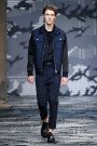 Neil Barrett stepped away from his sporty, street-vibe style and managed to change masculine classics from around the world to a modern universal wardrobe. The look was still urban and fresh, yet more ageless in design. He used batik prints, camouflage, nautical stripes and kimono patterns – reworked and fused together to conjure “an idea of a global masculinity.”  The mix of patterns did not overwhelm, because Barrett kept them together with one color story: all gradations of navy and indigo, with touches of black and white. The tight palette counterbalanced a wider spectrum of fabrics, with lots of denim. Low in the crotch but narrow on the hip, cuffed or with rolled-up hems, the  indigo bottoms let off an air of American workwear. Barrett performed the trick on non-denim, too, experimenting with slouchy and easy silhouettes as opposed to his usual sharp-cut look. As for tops, the designer went with spring’s hot new category: sleeveless V-neck tunics.