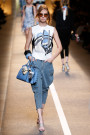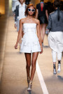 Luxurious, sophisticated, elegant; words coming to mind while watching Bottega Veneta’s fifties style collection. Undone ballerina buns, multicolored brogues and the label’s famous leather bags were the extra’s to Tomas Maier’s feminine summer creations. In a palette of faded pastels, denim blue and black he sent out his flattering city chic designs. Silky tops with tied belts, a floor sweeping trench, high waisted shorts and a cropped top, belted gingham dresses and long cardigans. Dark denim almost came in disguise, used on a number of dresses, a suit and a very masculine pair of jeans. Dark denim that turned into black for evening with floral appliqués to add some extra glamour. With a summer wardrobe like this, BV’s woman will never be underdressed.