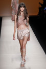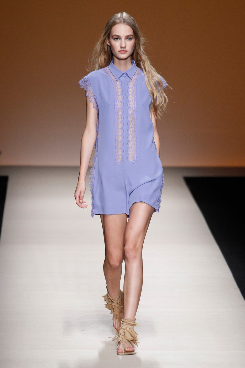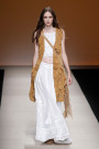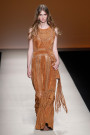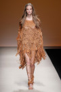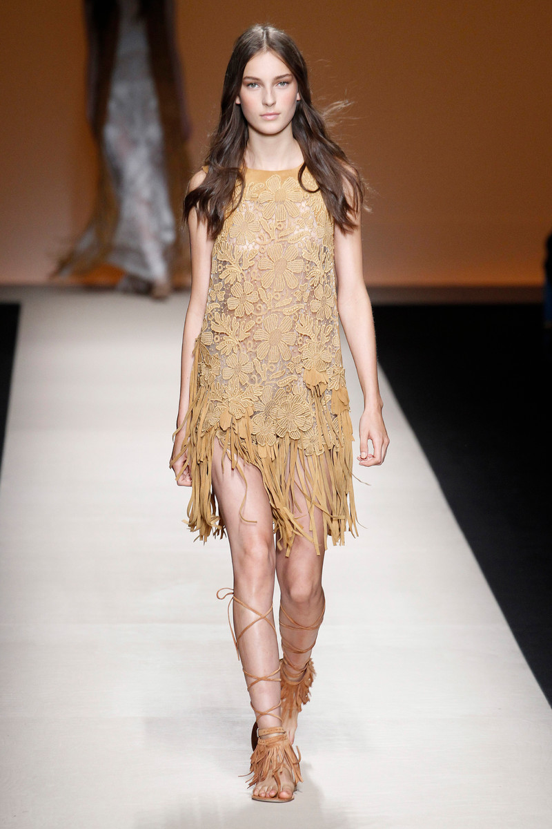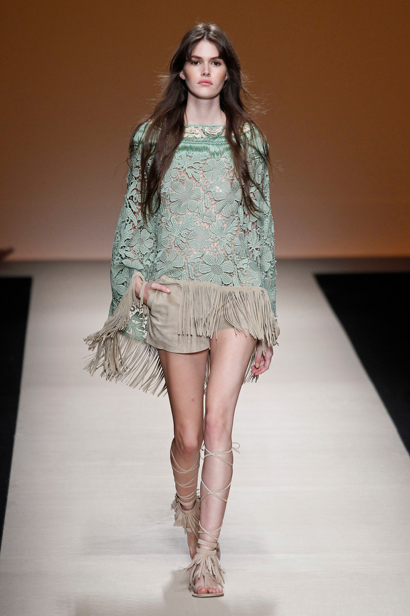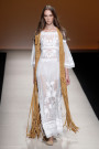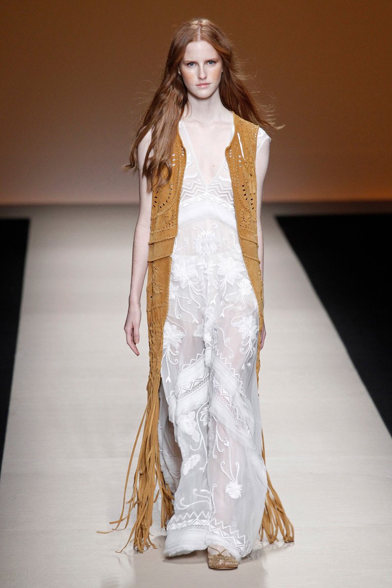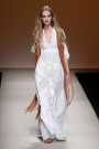 Floor sweeping maxi dresses, pastel shades and embroidered flowers; Alberta Ferretti is sticking to her sweet, soft and feminine signature. Yet, for s/s2015 the Italian designer did manage to appeal to a slightly younger target group. Instead of just perfect, romantic wedding guest proof dresses she dug into the free spirited world of hippies and festivals. In between her series of seventies inspired designs she surprised us with a few denim creations as suede, feathers and countless fringe accents added to the hippie vibe of the collection. White lace, floral embroidered dresses paired with suede waistcoats and fringed gladiator sandals certainly deserve a place at next year’s Coachella. As does a silky pair of shorts combined with a brown shaded braided crop top. And for anyone not attending a wedding or festival Alberta came up with an embroidered nude jumpsuit and a lilac playsuit that will do well as summer chic office attire