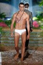 ‘James Dean crashed with his plane on a tropical island and adapts’, that was in short the story that inspired the Caten-twins to design their ss14 DSquared-collection. The show opened with a model taking a shower under a tropical waterfall wearing nothing than a pair of briefs from the duo’s new underwear and swimwear-line. The James Dean the duo imagined chopped off his cotton pants at mid-calf, but kept his biker jacket. Also in hun survival-wardrobe: Bermuda shorts with tropical motifs and rockabilly T-shirts, slouchy, laser-cut shorts and jackets made from a lightweight, waterproof fabric.