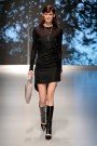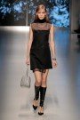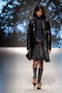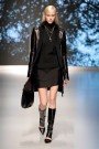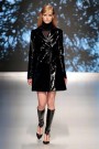 Apart from a few high heels, shoes were flat (at the end with a gilded toe) and ridingboots played a major role. Long fur stoles, wound around the neck like boas, and snug fur capes added drama to austere daywear: strapless tops ending in peplums and A-line tunics fronted with a corset traced out in felt. Skirts flared gently and fell about the knee. There were not many prints, only a few at the end of the show: wintry drawn landscapes and black-and-white scribbles adorned skirts and tops outlined with leather taping.