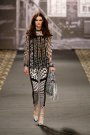 Cavalli took his party back to the sixties as he presented long sleeved, drop waisted dresses, mostly in black and white. His signature animal prints were mixed up with typical sixties prints, like a leopard print slowly evolving in a hounds tooth version.