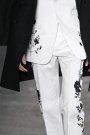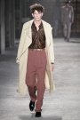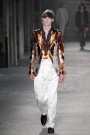 You need a true British designer to add some rock ‘n roll to the Milan menswear Fashion Week. After days of decent suits, sportswear and pale colors, the Alexander McQueen-collection brought wit, romance and the expressionism of Mick Jagger and David Bowie to the catwalk, although it lacked a bit of McQueens’ own provocative and edgy elements. There were Savile Row jackets in bold black & white checks or peacock shades, as well as the loose trousers in candy red & white stripes or hammered satin. Burton also presented varsity-style jackets in leather and suede, a flame-print evening jacket and a white coat with bold red spray-effect bands.
