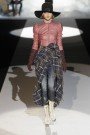 The fall-collection Dean and Dan Caten sent oput this morning was the same theme their menscollection had: early American settlers mixed with tough biker chic. The basis: ultra tight jeans, leather bikerjackets or jackets with pouf peaked shoulders and nipped in the waist, white shirts, long coats and lace up boots set on iron-blades, ice-skating style. There were also bustier tops, floor-sweeping leather dusters, plaid hotpants, fringed blankets worn as capes or wraps and massive fur coats.