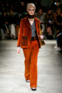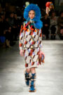 Miucca Prada still believes in style as a mighty power to fight for women’s rights. She took traditional trappings of glamour — feathers and embroidery — and lavished them on everyday staples: pencil skirts, cardigans, tailored jackets, bear-hug outerwear, a chemise here and there. Often, these came in weighty fabrics — corduroy, thick knits, tweeds, shearling — put together in audacious collages of color and pattern, atop heels fastened with giant buttons or big, furry multicolored mukluks. Orangey tweed and leather jacket over bright yellow skirt with red embroidery and blue white feather hem? Cocktail dress with feathered bonnet? Prints done in collaboration with artist Robert McGinnis? Whatever their politics, fashion ladies will succumb to the seduction.