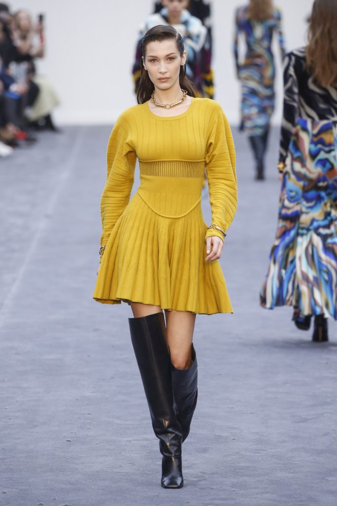 They were meant to resemble animal prints, yet the show’s opening look (and many more to come) looked more like a kaleidoscopic pattern. Paul Surridge alternated those printed looks with bold colored pieces like a structured yellow dress, a turquoise colored suit (menswear) and a deep pink pleated skirt. Pants were high waisted, skirts and dresses had a midi length. And the prints slowly turned from bright colored and kaleidoscopic to earthy toned and sequined. As far as the menswear part of the collection was concerned things were smooth and perfectly tailored. On the womenswear part the collection lacked a bit of Cavalli’s seductive signature. The looks didn’t necessarily breath the Cavalli sex appeal (although Bella looked stunning in a body tight all black look, yet his could have been a look from any given designer). Surridge has been with the label for almost two years now, yet we’re not sure what direction he’s going with Cavalli just yet.