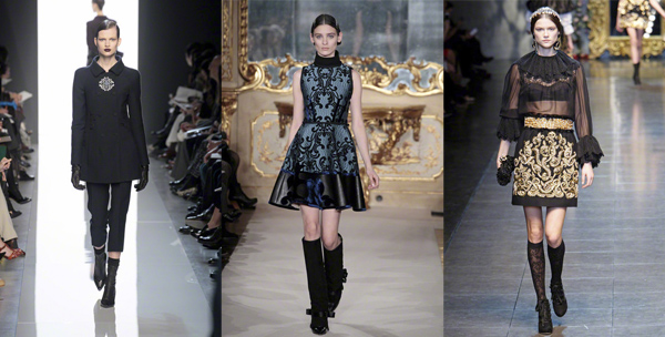 Many designers explored a dark color palette, but the DARK VISION of Dolce & Gabbana was at the same time an Italianate vision of palazzo life. They showed, as Bottega Veneta and Aquilano.Rimondi did, a more costume message.