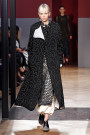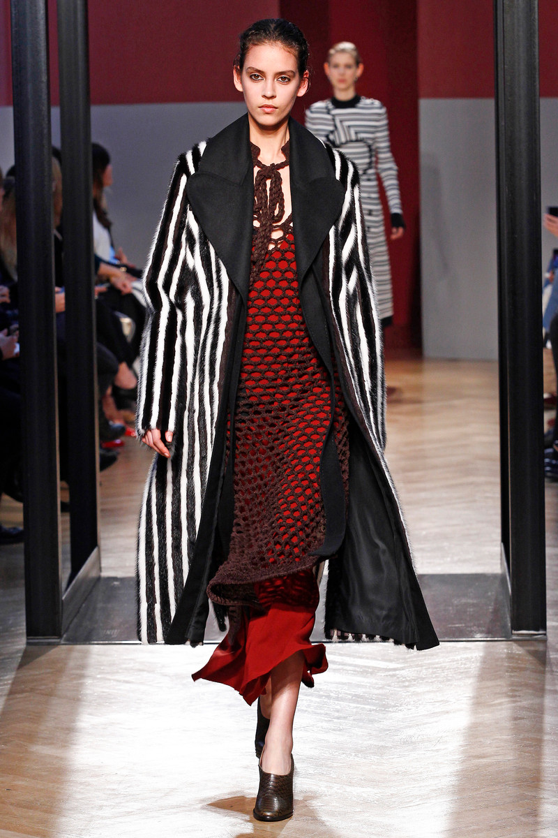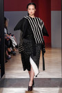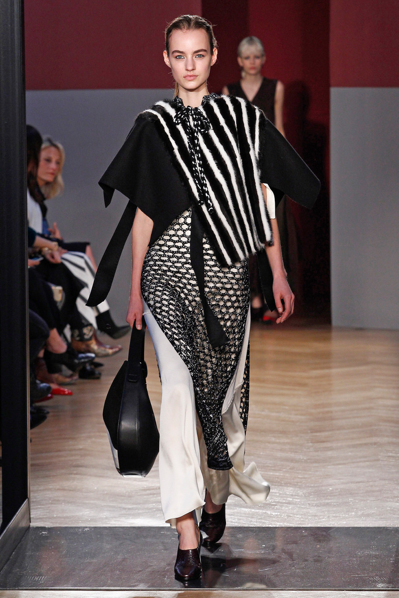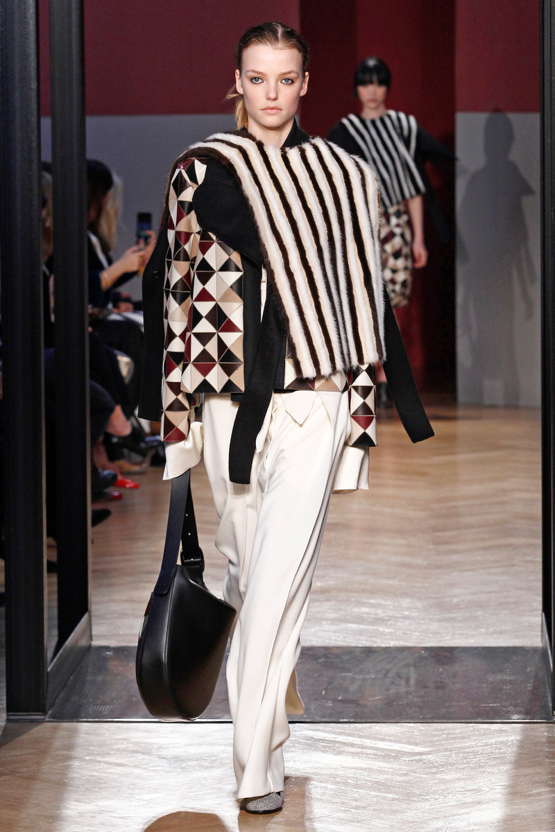Shades of terracotto, olive green, off white, brown, black and one touch of yellow formed the lovely Moroccan-eske color palette at Sportmax. Within that mix of hues was a game of print and proportion going on. Stripes and other puzzling graphics (almost a real puzzle print towards the end) formed the outstanding factors on some of the asymmetrical dresses, the fluffy sweaters and the statement outerwear.