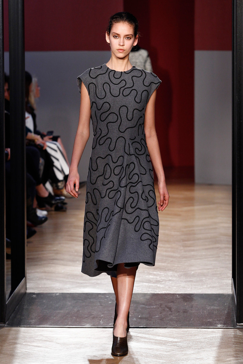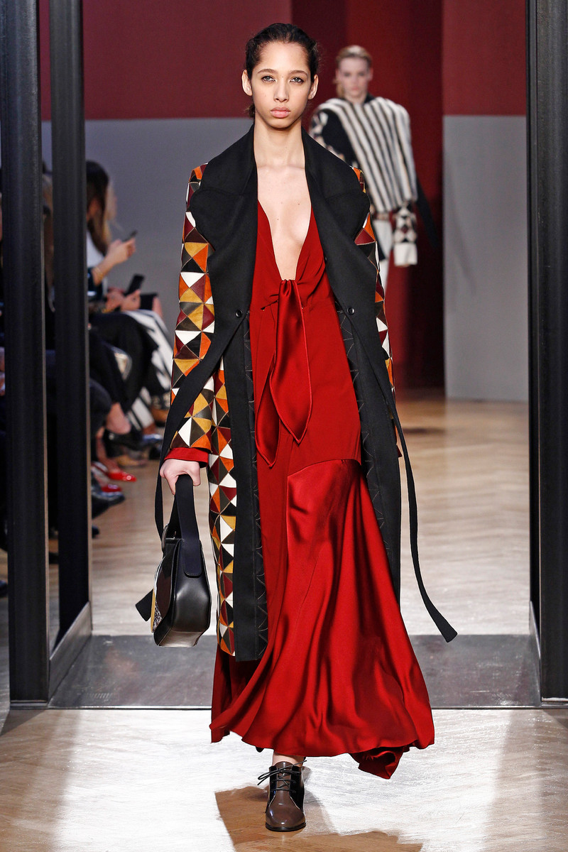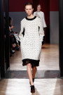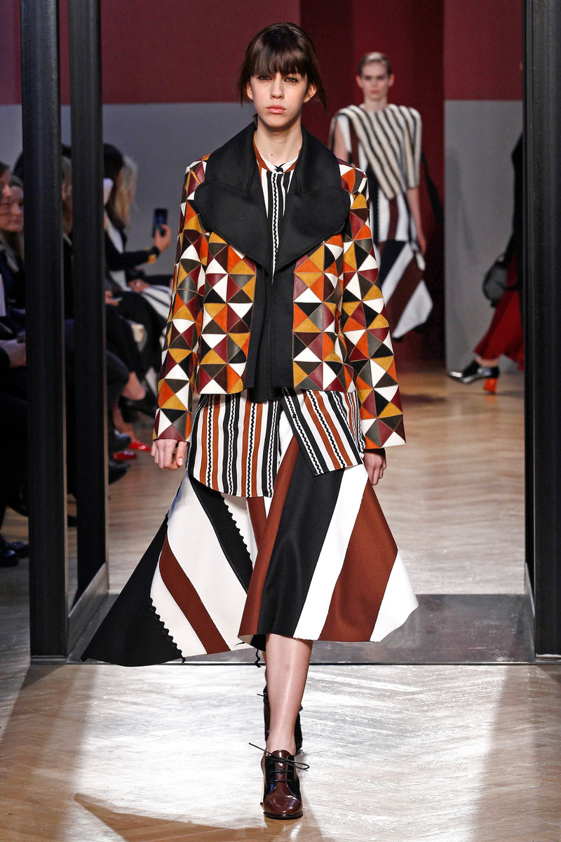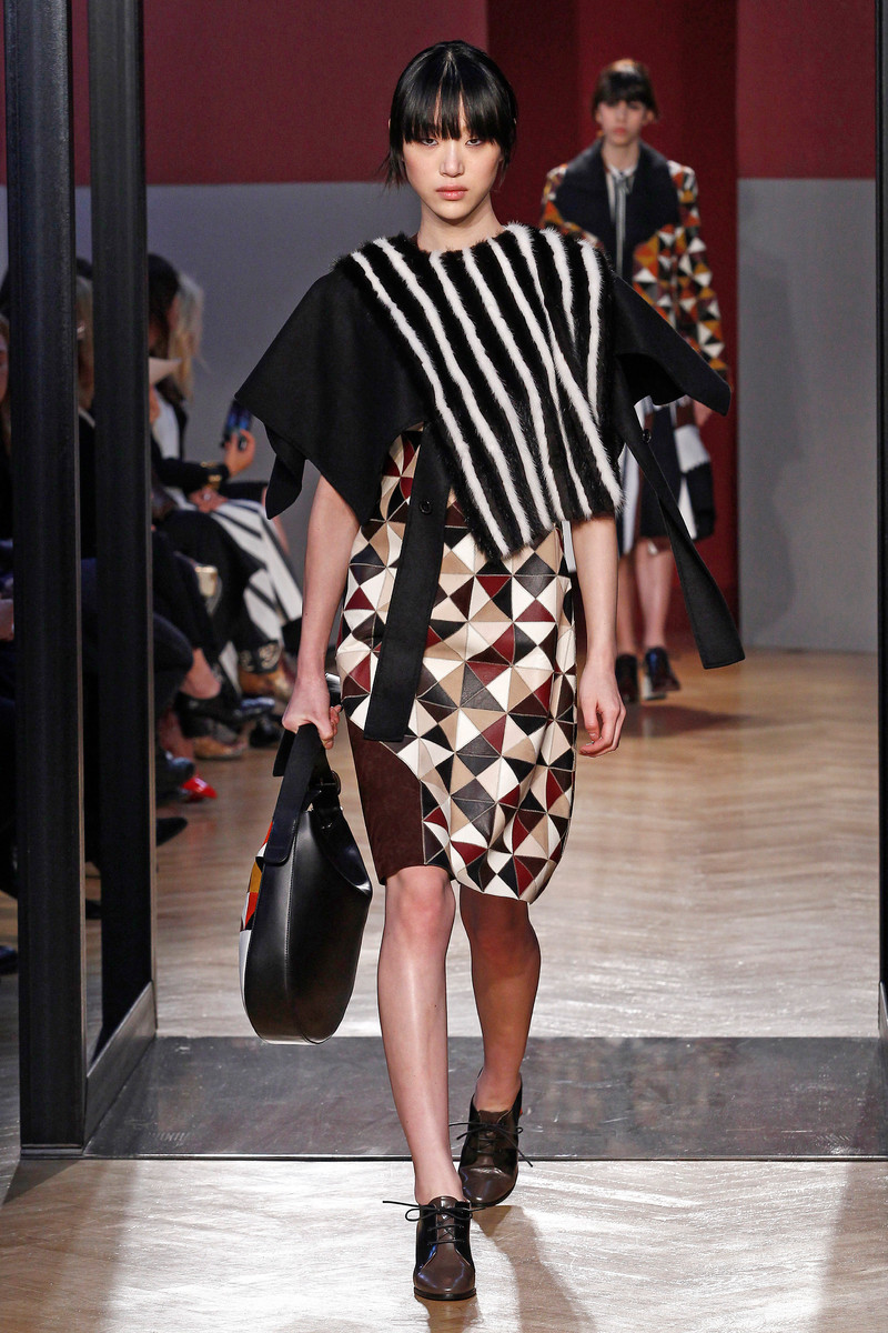 Shades of terracotto, olive green, off white, brown, black and one touch of yellow formed the lovely Moroccan-eske color palette at Sportmax. Within that mix of hues was a game of print and proportion going on. Stripes and other puzzling graphics (almost a real puzzle print towards the end) formed the outstanding factors on some of the asymmetrical dresses, the fluffy sweaters and the statement outerwear.
