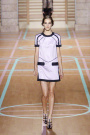 Basketball jerseys were turned into tank dresses with black pining. Track-suits were appeared in leather (jackets) and transparent chiffon (pants). The silhouette was definitely sporty, but the result was chic and glossy. The cheerleaders got swinging pastel dresses with cut-outs at the shoulders and ribs plus beautiful leather heels.