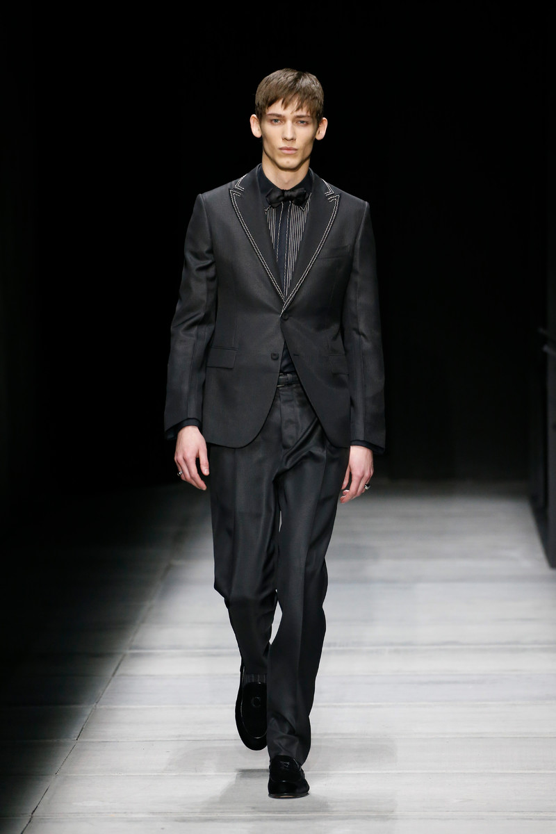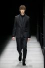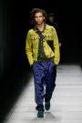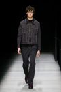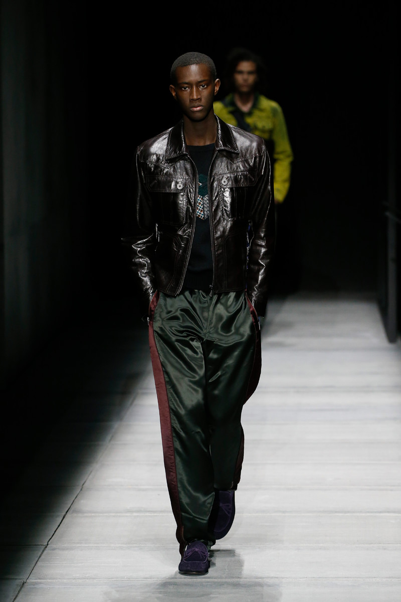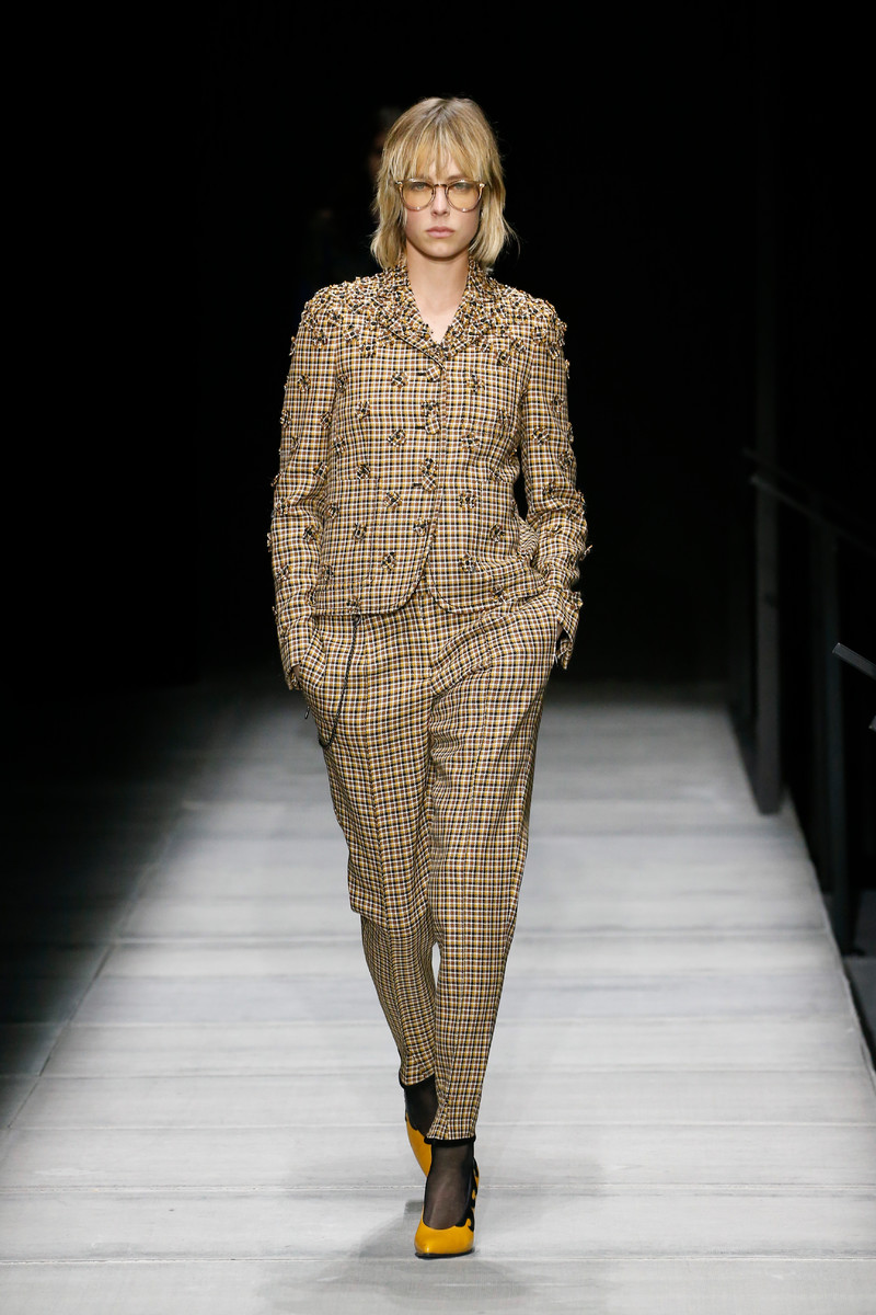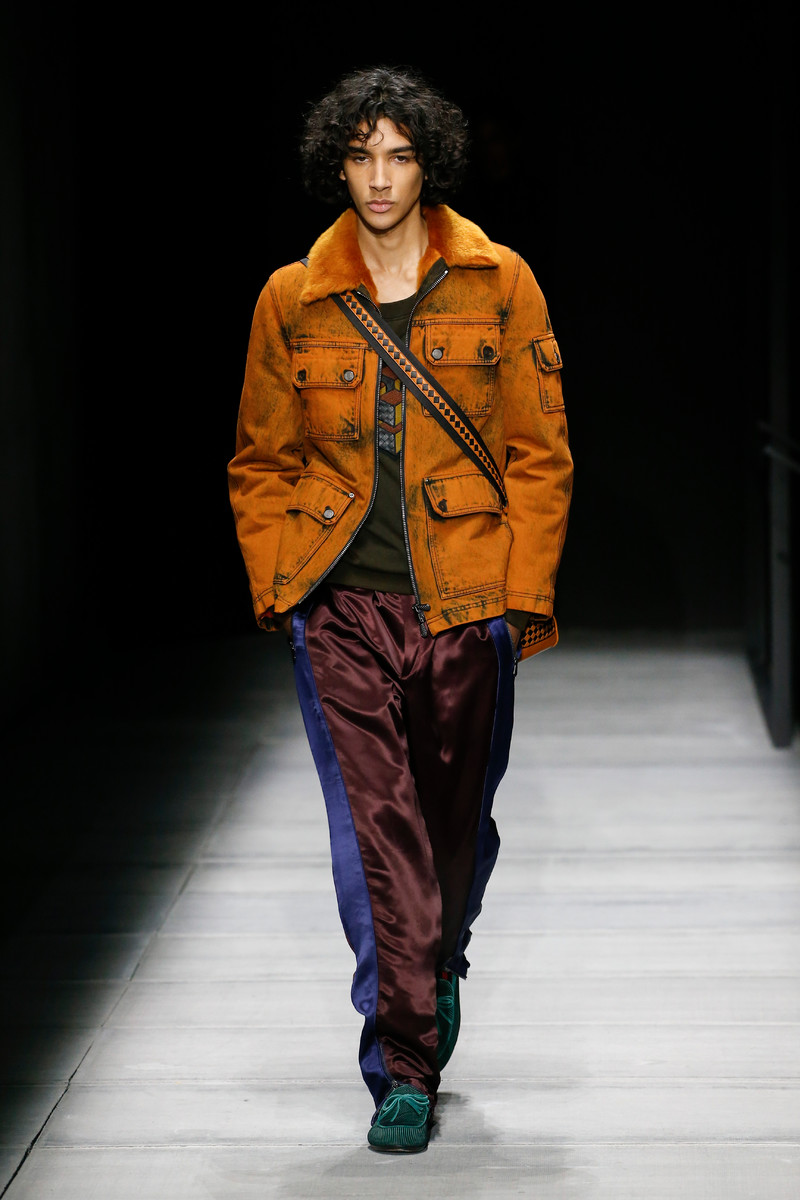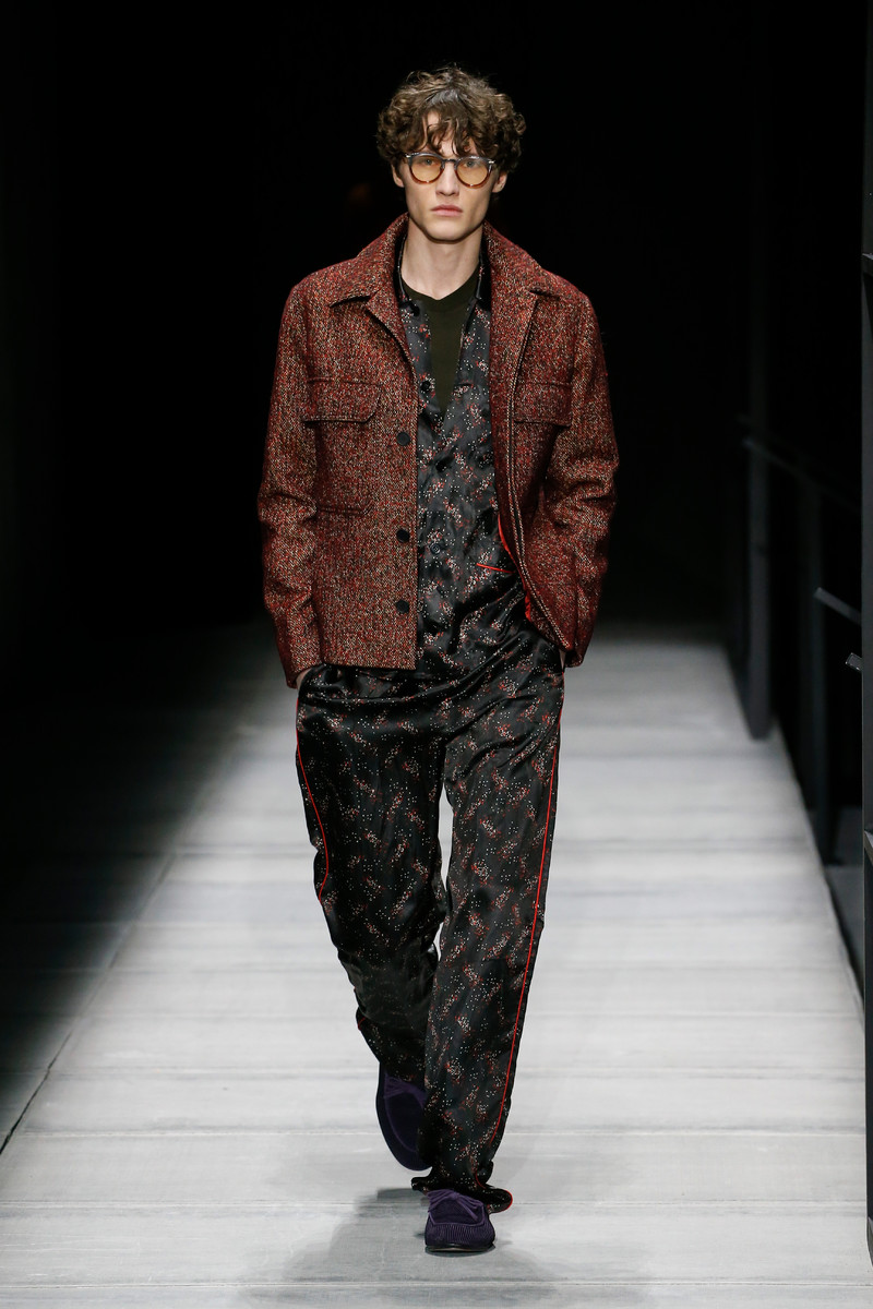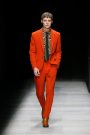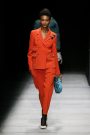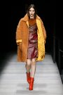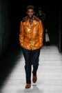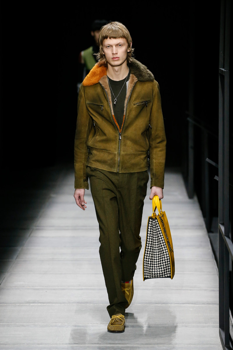 While Maier referred to his tailoring as sharp, it had an off-beat zip, as in a double-breasted orange suit with multiple, demonstrative pockets. The coats were fabulous, almost all bonded fabrics that looked different outside and in, delivering that intimate luxury for which Bottega is famous: camel mohair and wool tiger stripes were bonded to satin; crinkled orchid satin to gray felt.