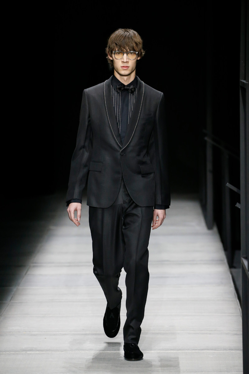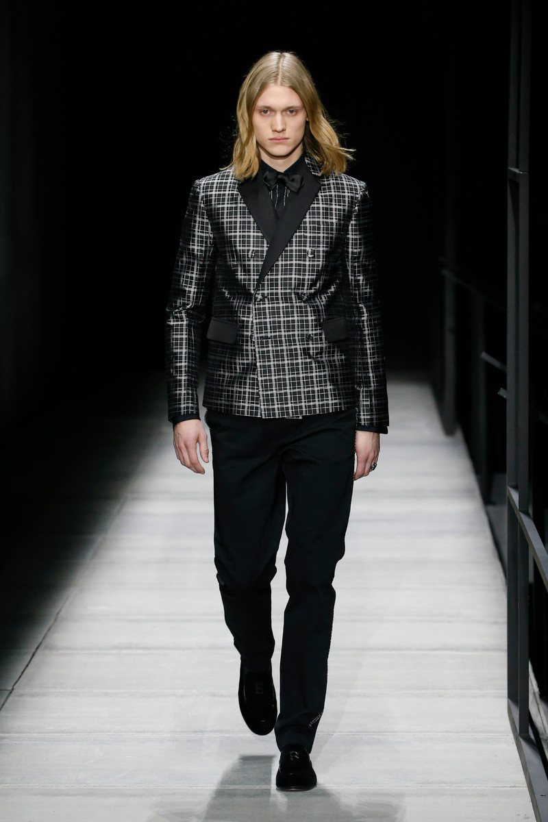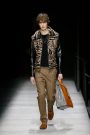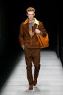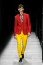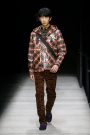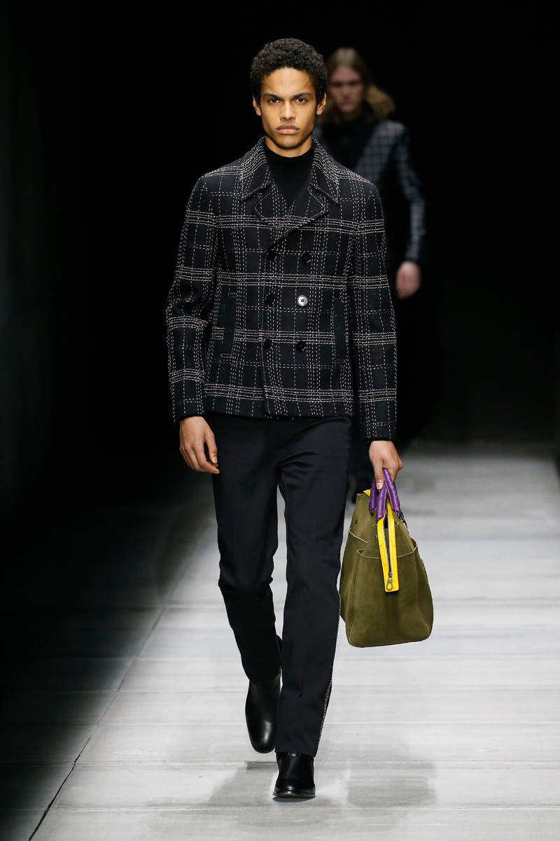 Maier’s men’s wear reflected a similar fusion of “notice me” confidence with adult sophistication. The designer focused on sportswear looks anchored by an impressive array of jackets and coats, including several shearlings printed with zebra stripes. The cube motif surfaced in a grid pattern etched on a red tailored jacket over bright yellow pants, as well as bold color blocks for pants and a coat.