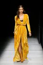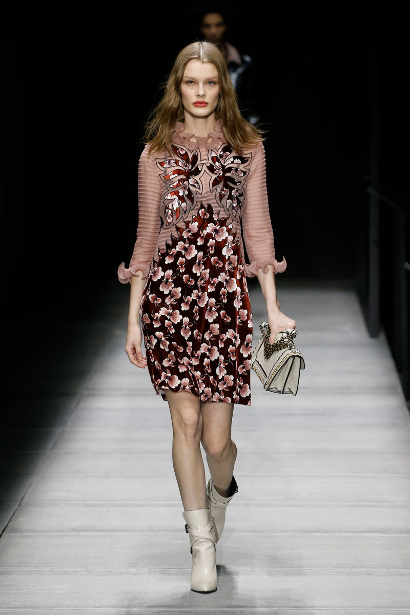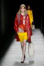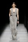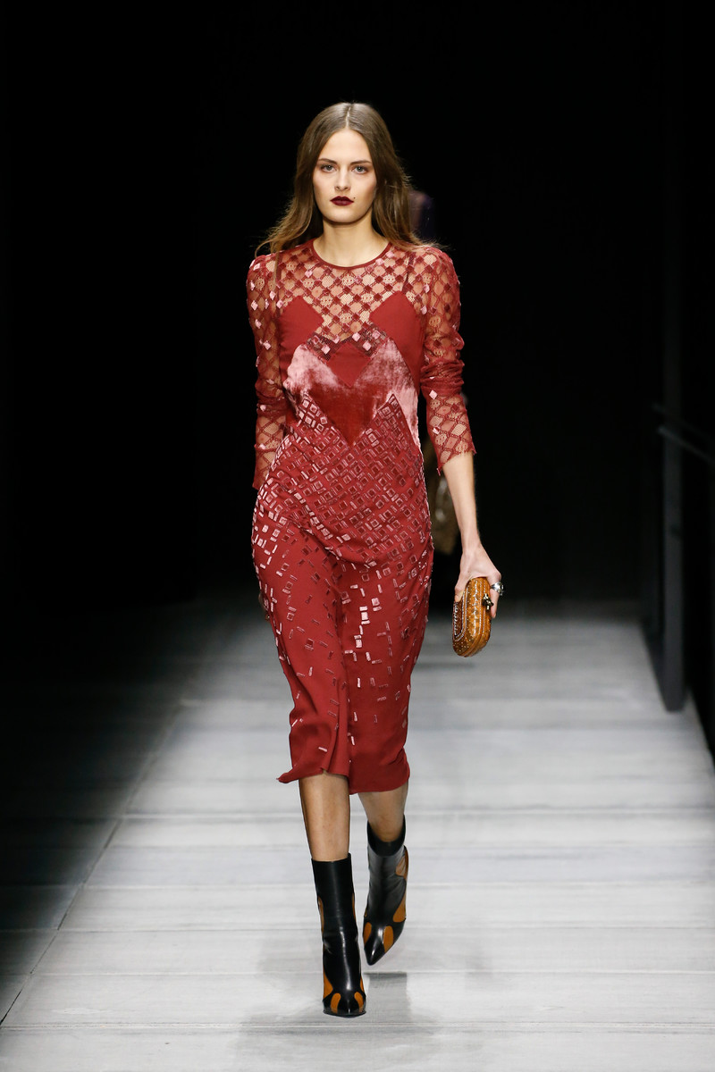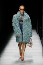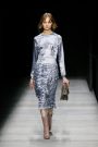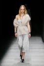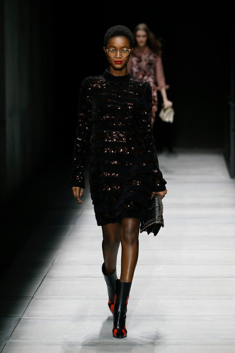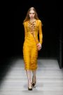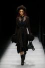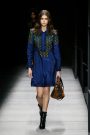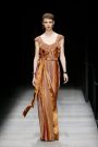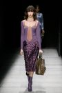 Tomas Maier – the designer of Bottega Veneta, decided to present the fall-collection in New York because of the opening of a flagship-store in the Big Apple. Maier’s color-palette worked the wearable side of flamboyance — marigold, wine, purple and his silhouettes shunned citified cliché. He opted for relaxed shapes and intense surface interest. A skirt was embroidered with a demonstrative, artisanal riff on the cube motif. A dress featured two overlays of fabric cut away into geometric motifs; another contrasted shiny and velvet sequins. Fine outlines on dresses and skirts that at first glance looked like stitching were actually delicate chain embroideries.
