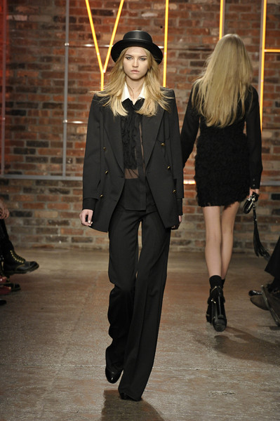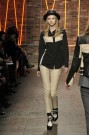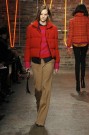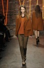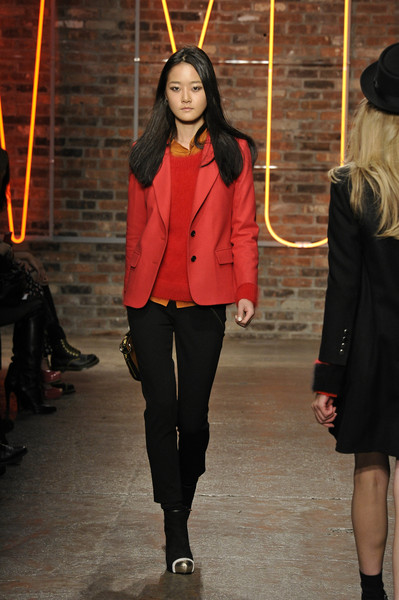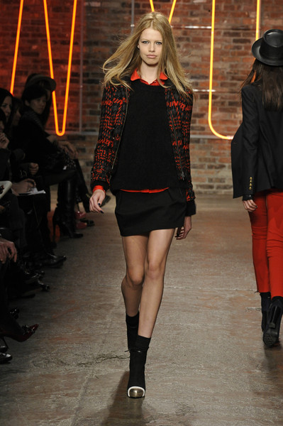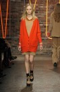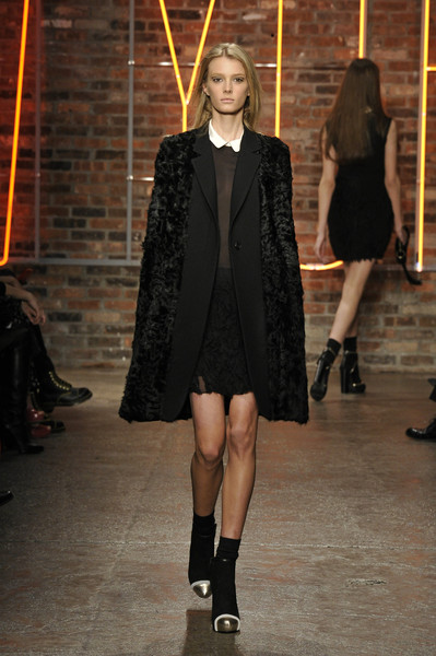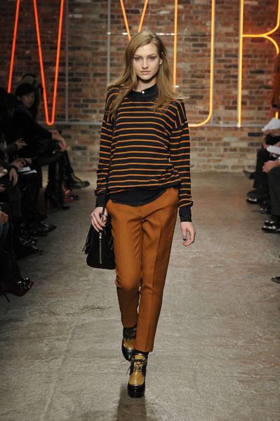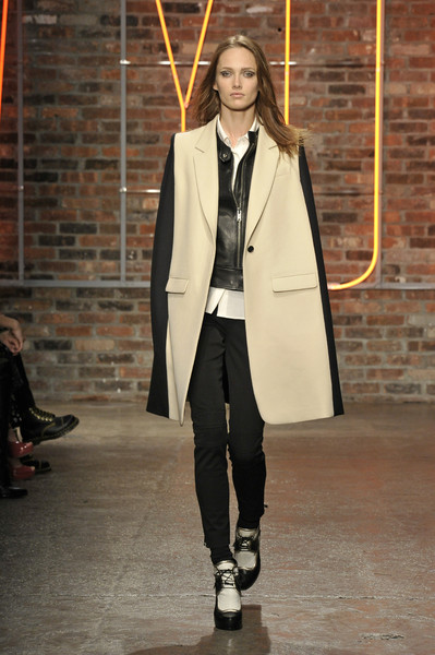 There were endless excellent choices on offer for next season at DKNY, with a theme called New York Mods. Donna Karan did those coats tailored and graphic, like the black styles with a bold white panel across the chest, adding a little edge with leather sleeves. Toward the end there were knit puffers and furs. It was all sharp and suitable for everyday use. Same goes for what was worn underneath. Tough menswear in sharp, colorblocked tailoring mixed up with motorcycle jackets. Karan worked up chunky knits with a preppy tomboyish flare: bright cardigan dresses and stripey angora sweaters were worn with tailored trousers, tapered and flared. It was a cool and right on time collection.