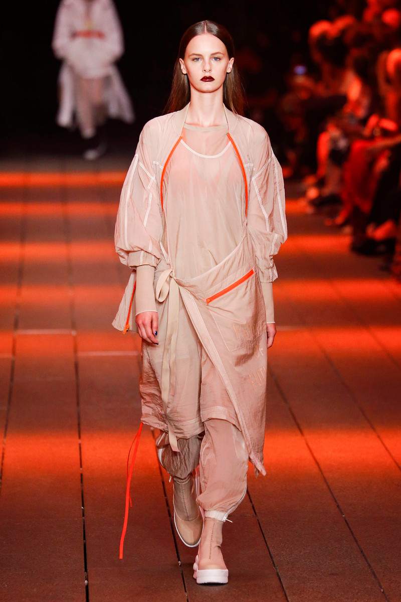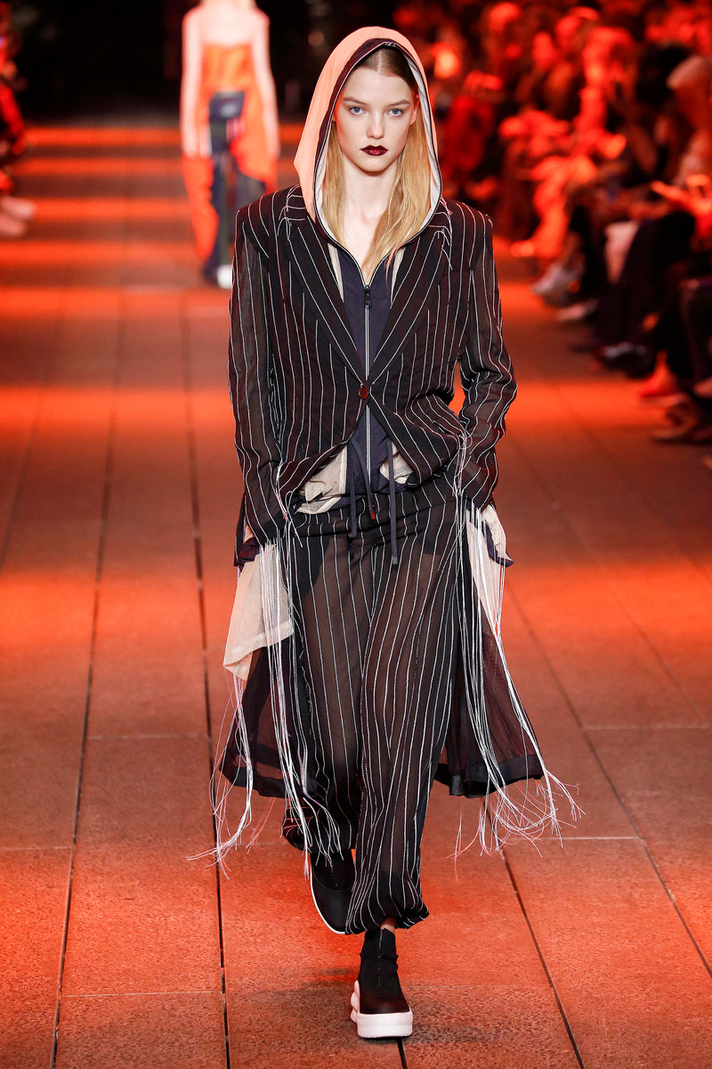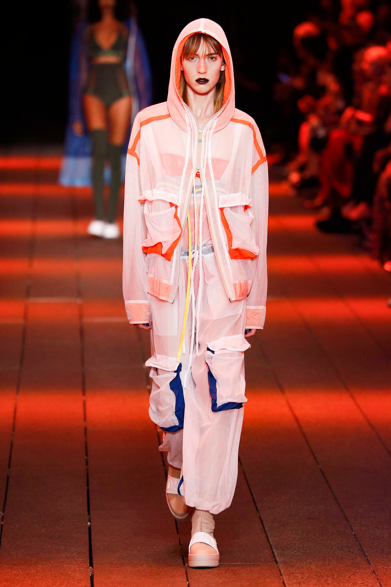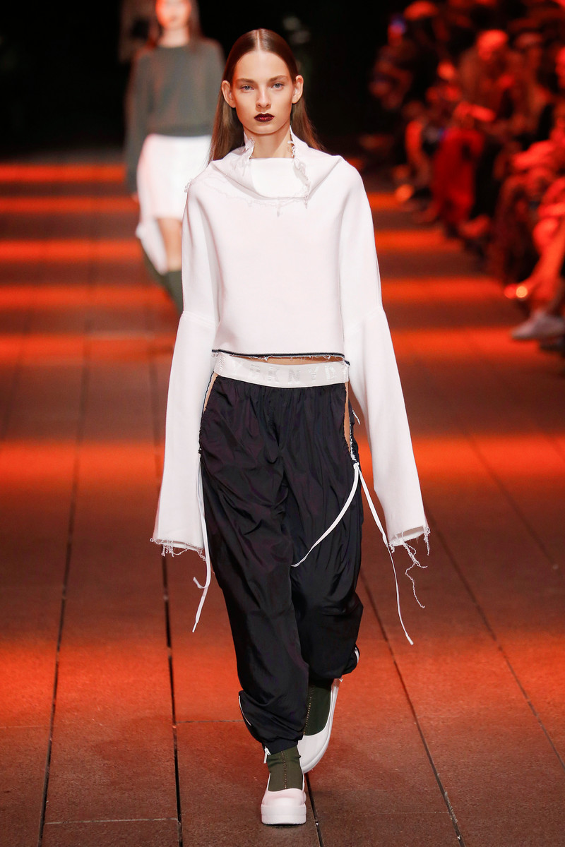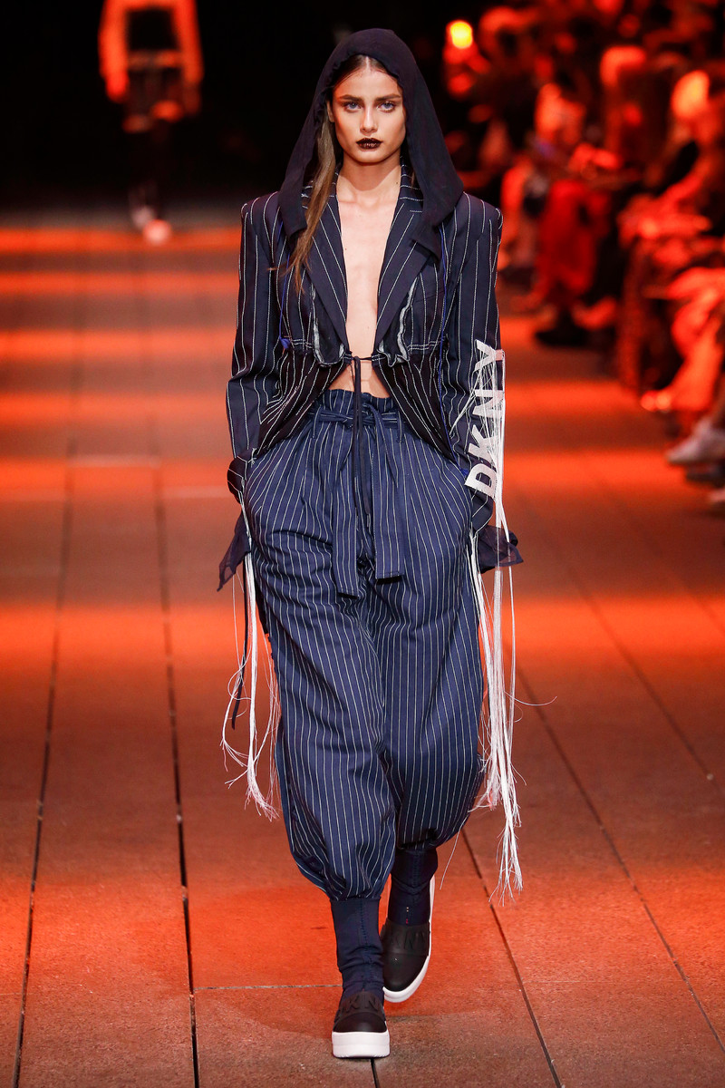 The hoodie is having a big moment in fashion this season. And if it’s up to DKNY designer Osborne and Chow that trend is to stay around a little longer. For spring/summer the designer duo introduced a sportive ready to wear range full of activewear. Their model pack, lead by Bella Hadid, looked extremely tough in next season’s boiler suits, slouchy hoodies, DKNY branded sport bras and sheer jackets. Done in a palette of khaki, taupe and navy the items looked suitable for hitting the concrete jungle, NYC, where the all American brand, that was sold to a new company in order to start making profit again, has it roots. We’re not sure if the original DKNY costumer is up for this kind of streetwise fashion. Yet this youthful range will definitely appeal to a fresh young customer. And that might just be the key to the brand’s revival. At least Donna Karan, who sat front row at the show (with a broken foot) was all smiles.