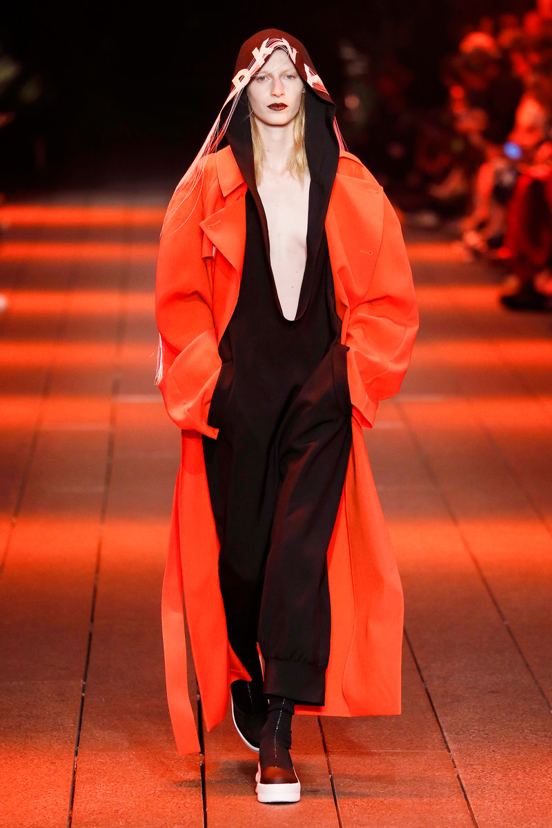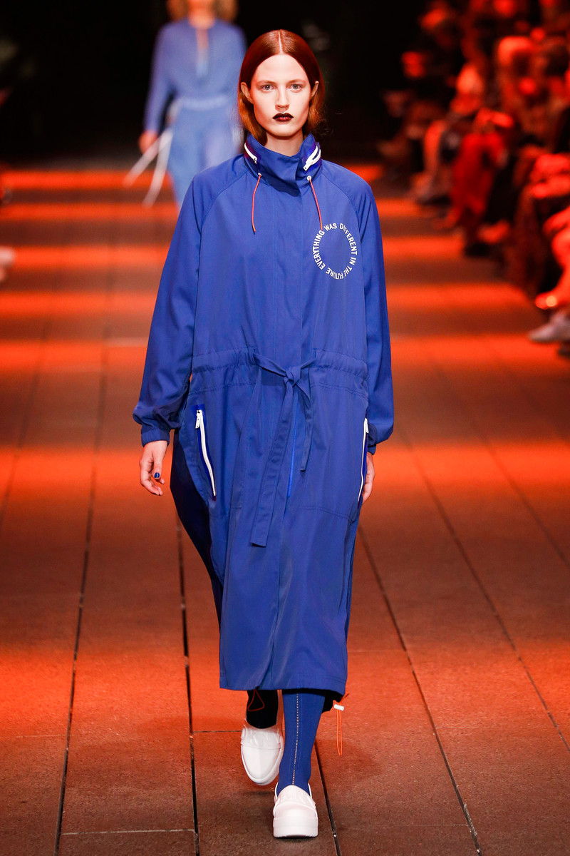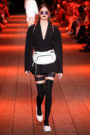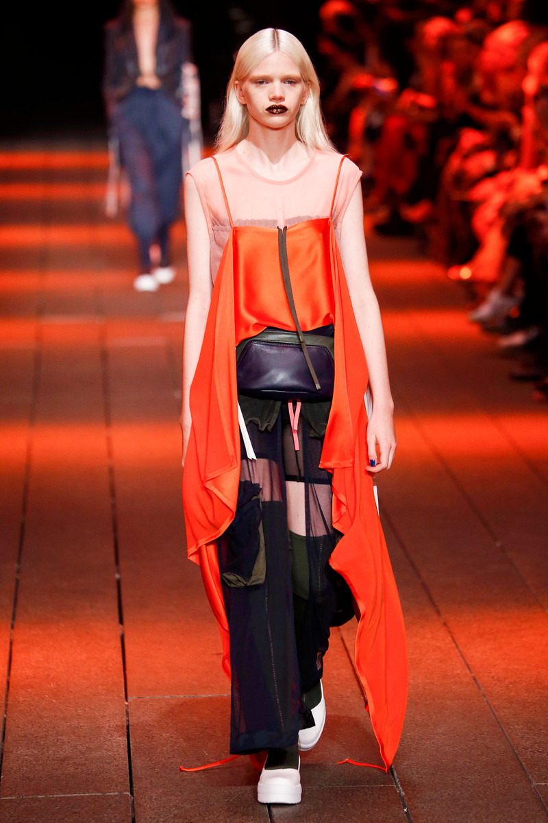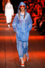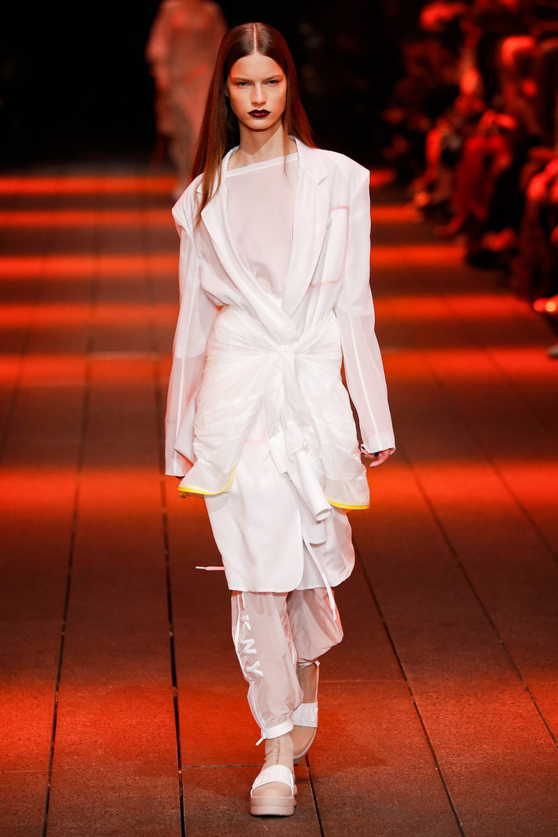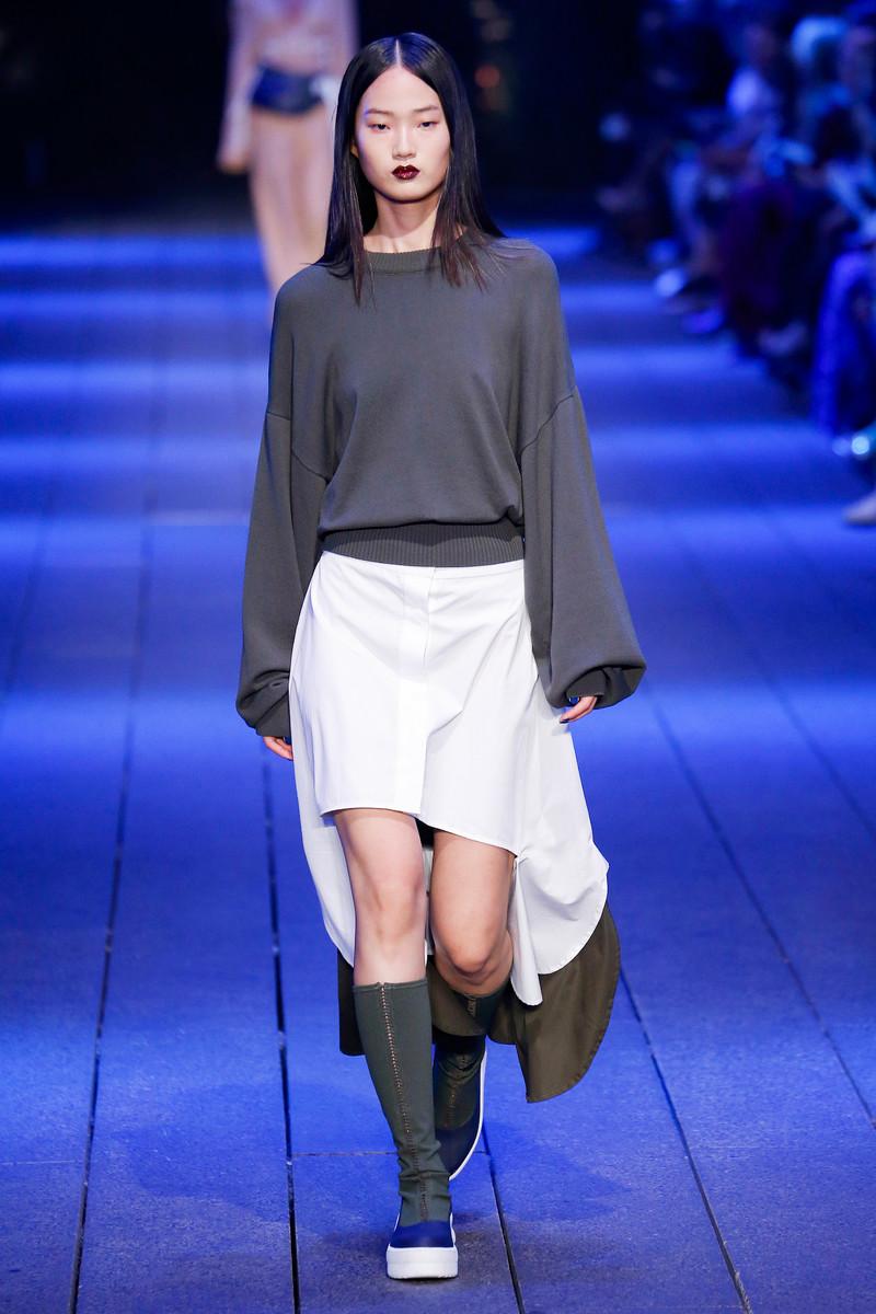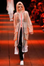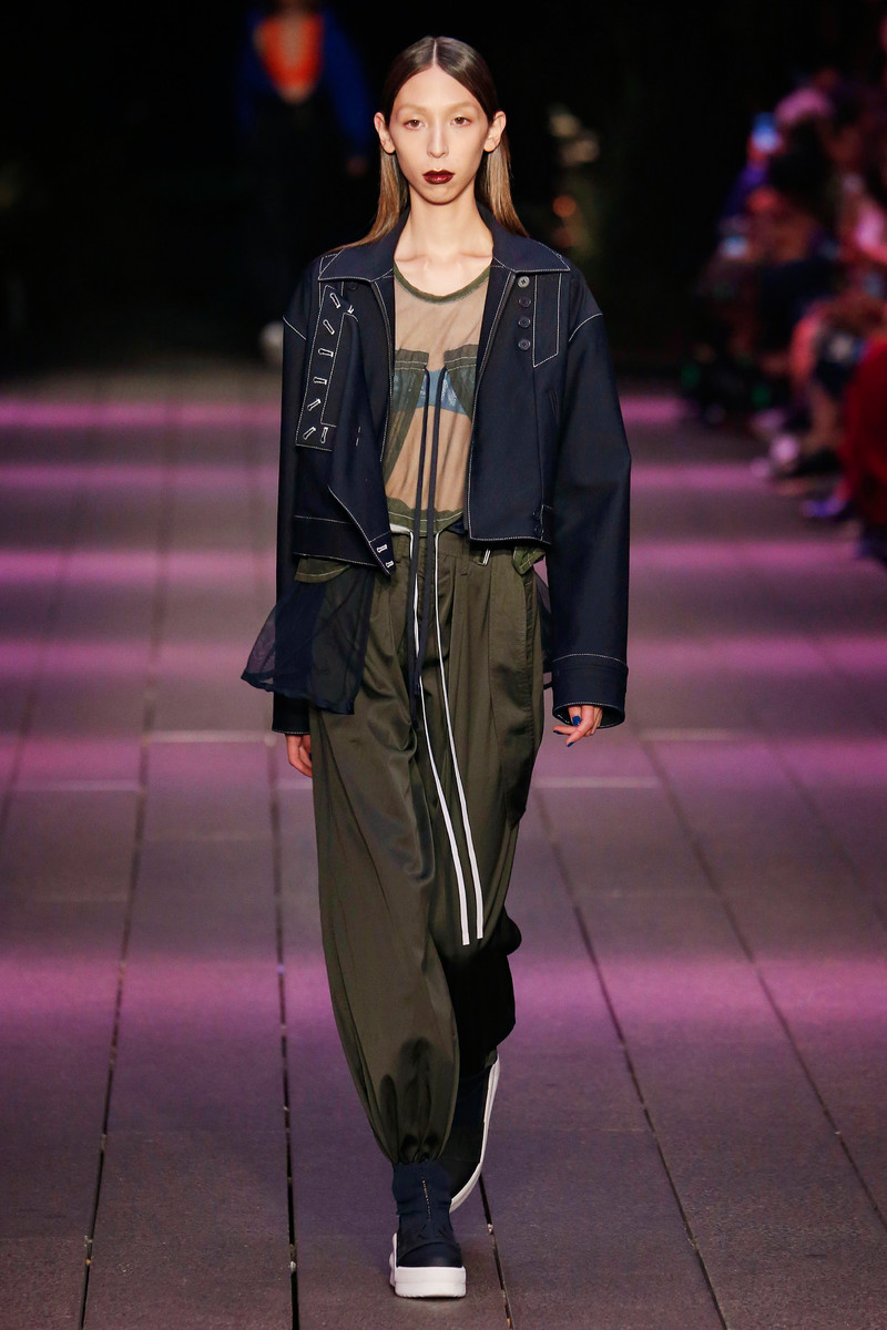 The hoodie is having a big moment in fashion this season. And if it’s up to DKNY designer Osborne and Chow that trend is to stay around a little longer. For spring/summer the designer duo introduced a sportive ready to wear range full of activewear. Their model pack, lead by Bella Hadid, looked extremely tough in next season’s boiler suits, slouchy hoodies, DKNY branded sport bras and sheer jackets. Done in a palette of khaki, taupe and navy the items looked suitable for hitting the concrete jungle, NYC, where the all American brand, that was sold to a new company in order to start making profit again, has it roots. We’re not sure if the original DKNY costumer is up for this kind of streetwise fashion. Yet this youthful range will definitely appeal to a fresh young customer. And that might just be the key to the brand’s revival. At least Donna Karan, who sat front row at the show (with a broken foot) was all smiles.