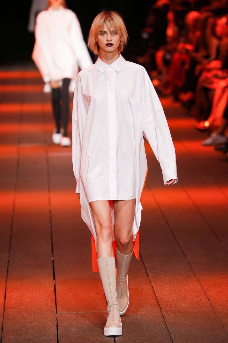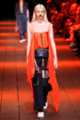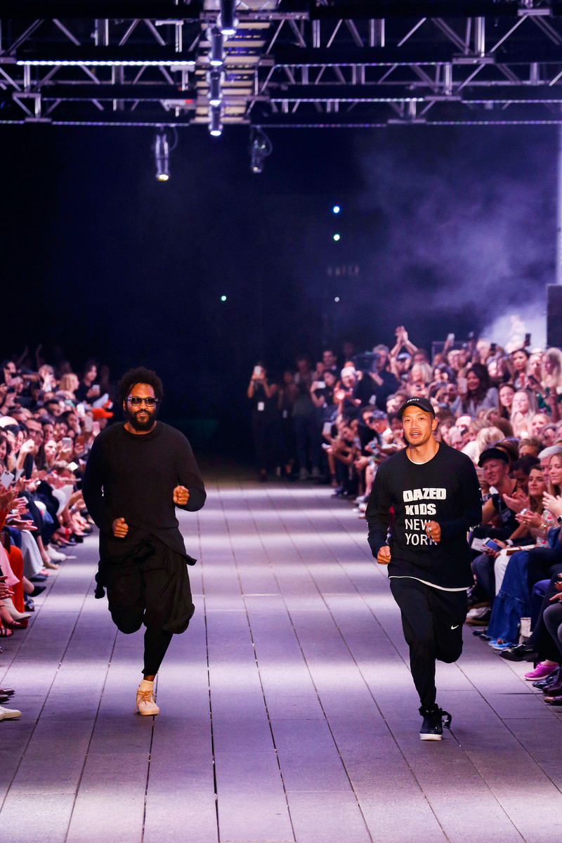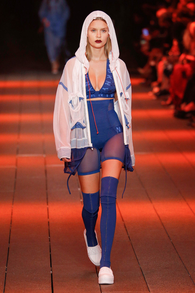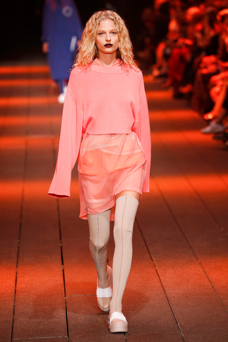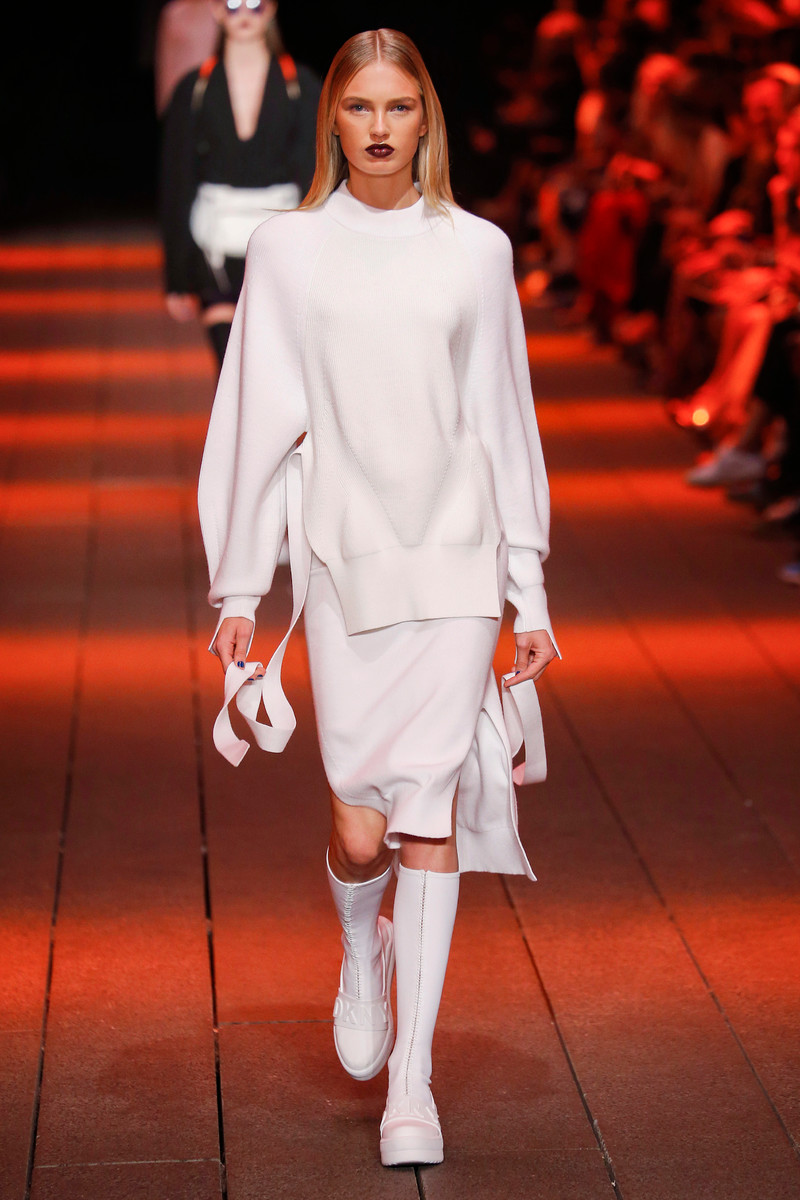 The hoodie is having a big moment in fashion this season. And if it’s up to DKNY designer Osborne and Chow that trend is to stay around a little longer. For spring/summer the designer duo introduced a sportive ready to wear range full of activewear. Their model pack, lead by Bella Hadid, looked extremely tough in next season’s boiler suits, slouchy hoodies, DKNY branded sport bras and sheer jackets. Done in a palette of khaki, taupe and navy the items looked suitable for hitting the concrete jungle, NYC, where the all American brand, that was sold to a new company in order to start making profit again, has it roots. We’re not sure if the original DKNY costumer is up for this kind of streetwise fashion. Yet this youthful range will definitely appeal to a fresh young customer. And that might just be the key to the brand’s revival. At least Donna Karan, who sat front row at the show (with a broken foot) was all smiles.