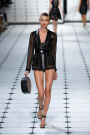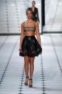 A point d’esprit bra ­— Wu collaborated with La Perla on the innerwear pieces — topped a short flounced leather skirt with laser-cut embroidery; a sleeveless white blouse with black lace inserts went with leather shorts. Wu softened the look a bit with lace blouses and cigarette trousers, and sheer and severe dresses.