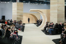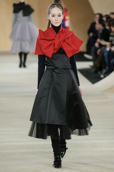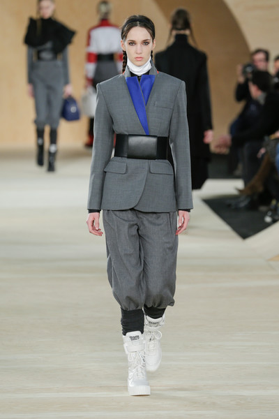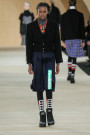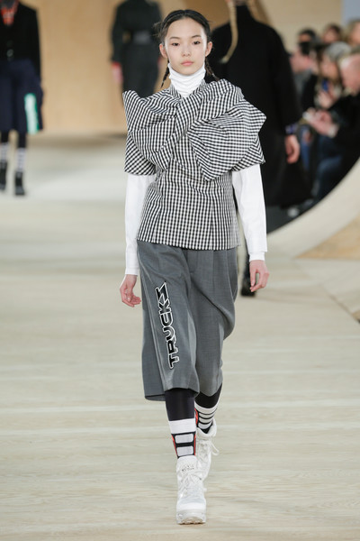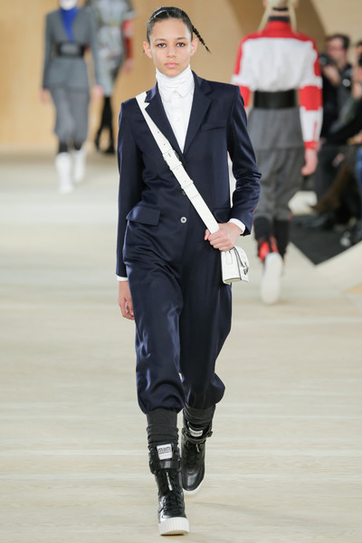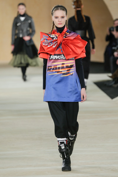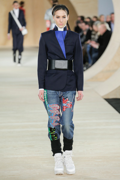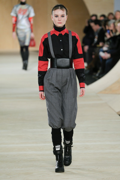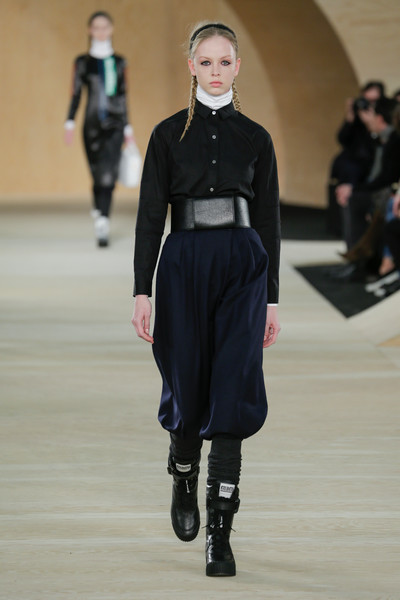 Spare tailoring was established first with a plain black shirt over a white turtleneck bodysuit and navy trousers, amped up with extreme accessories: a shiny black obi and giant high-tops. There were sharp blazers, long wrap skirts and neat coats, one with oversize fit, all of it cut with an edge. From there, Hillier and Bartley unleashed a surge of fearless, subversive spirit that mixed BMX style with Japanese manga and warrior motifs.