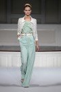 There were ladylike tweeds, windowpane plaids, and raffia embroidered linen garments. For cocktail hour, there were a number of modern dresses, like a strapless dress in navy gazar embroidered with black organza or a white swansdown tutu. The evening gowns looked like promdresses, some with just one shoulderstrap, the other with a matching bolero, ruffled or with embroideries all over.