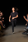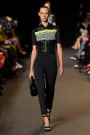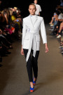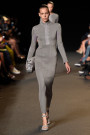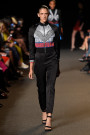Alexander Wang translated the big sneaker-trend into clothes. He offered what one wants out of a sneaker: fashion, flashy function and baseline comfort. What would a Stan Smith look like as a dress? Pretty cute, it turns out, in white with a perforated flared skirt and molded, mesh bodice with a lace-up collar and green neckline. The classic Adidas Original tennis shoe was but one — and the most kitschy — of several that Wang played with. He wouldn’t name specific brands and styles, but one could intuit a New Balance moment in the group of subdued grays, such as tight therms and stretch track pants. The overarching theme was sporty — the silhouettes were streamlined, sculpted to the body in athletic curves and treated with all kinds of fun, technical fabrications sprung from the language of sneakers: the barcodes from underneath the tongue decorated tailored black-and-white riffs on tuxedos; a gray shift was embroidered to look like a lug sole. But there was also a sleek romance to the collection. Wang closed the show with a series of bare, molded bodices crafted from colorful plissés and pleats worn with high-waisted black satin pants that buttoned up the sides.