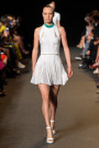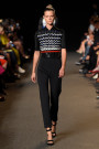 ‘New York Nation’ was the theme of DKNY’s bold spring collection, which aimed to celebrate the city’s color, culture and creativity. Donna Karan translated the idea via bright hues, several graphically rendered like a kaleidoscope on oversize silhouettes. Those included the striking red-and-blue V-neck tunic over a full skirt with a soft flounce. The subtler colors achieved more effect, such as the crisp mint-green parka shown with a striped T-shirt and a miniskirt. It still captured the energy of Gotham, but with just the right control.