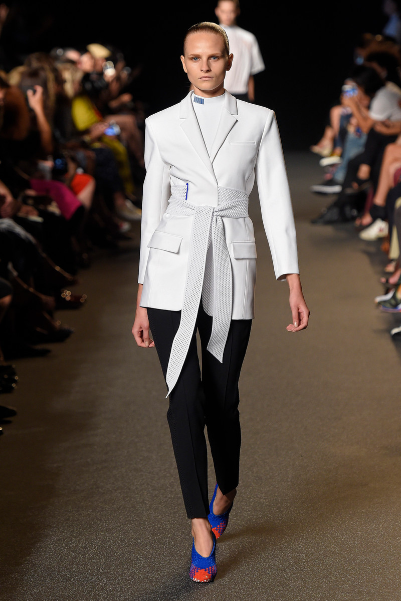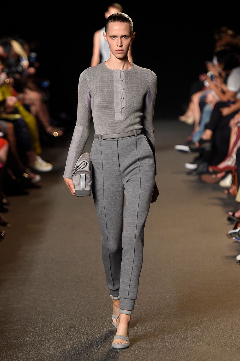 Alexander Wang translated the big sneaker-trend into clothes. He offered what one wants out of a sneaker: fashion, flashy function and baseline comfort. What would a Stan Smith look like as a dress? Pretty cute, it turns out, in white with a perforated flared skirt and molded, mesh bodice with a lace-up collar and green neckline. The classic Adidas Original tennis shoe was but one — and the most kitschy — of several that Wang played with. He wouldn’t name specific brands and styles, but one could intuit a New Balance moment in the group of subdued grays, such as tight therms and stretch track pants. The overarching theme was sporty — the silhouettes were streamlined, sculpted to the body in athletic curves and treated with all kinds of fun, technical fabrications sprung from the language of sneakers: the barcodes from underneath the tongue decorated tailored black-and-white riffs on tuxedos; a gray shift was embroidered to look like a lug sole. But there was also a sleek romance to the collection. Wang closed the show with a series of bare, molded bodices crafted from colorful plissés and pleats worn with high-waisted black satin pants that buttoned up the sides.