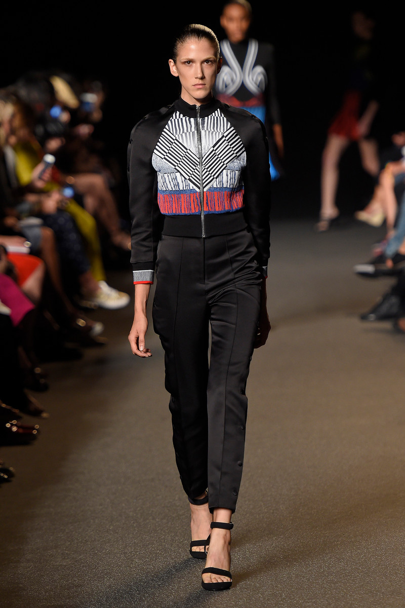 ‘New York Nation’ was the theme of DKNY’s bold spring collection, which aimed to celebrate the city’s color, culture and creativity. Donna Karan translated the idea via bright hues, several graphically rendered like a kaleidoscope on oversize silhouettes. Those included the striking red-and-blue V-neck tunic over a full skirt with a soft flounce. The subtler colors achieved more effect, such as the crisp mint-green parka shown with a striped T-shirt and a miniskirt. It still captured the energy of Gotham, but with just the right control.