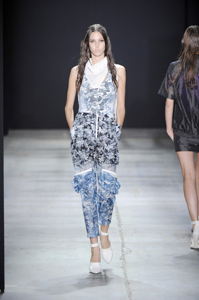 The models marched out with hands through the sheer pockets for a sporty Surrealist effect. Then came ombré floral prints, blue and gray with a Hawaiian flavor, on utility gear (a dress with oversize zip pockets; cargo pants worn with a mesh bustier). Leggings and track jackets looked like full racing suits with striped paneling and contrast color insets and they fitted like second skin.