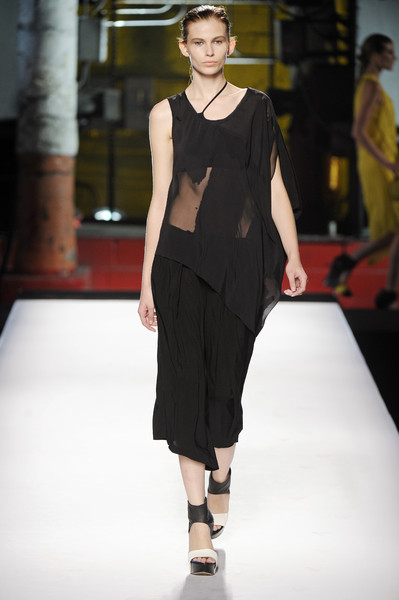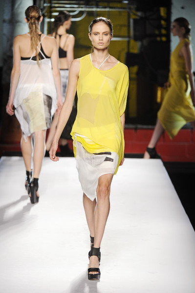The label Helmut Lang is back. Brought back to life by Nicole Colovos and her husband Michael. Richard Serra was the inspiration for their ss2012 collection, with lots of black, white and bright yellow, draping, layering and angular hemlines.