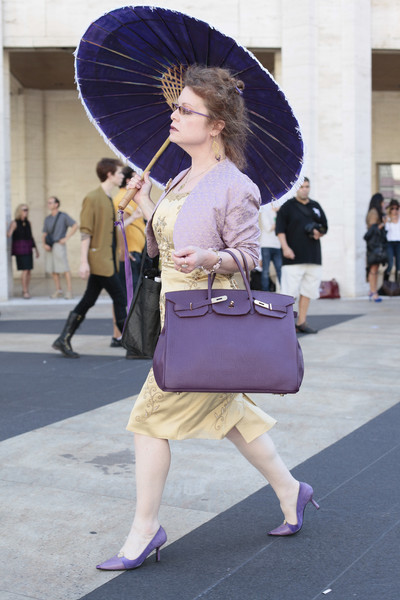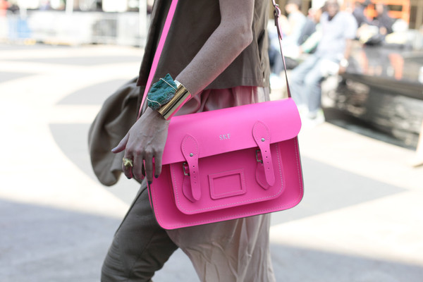 As for accessories, there were pointy pumps made from the exotic skins of tropical fish, floral bike helmets and cross-body bags that looked like golf club bags and weren’t much smaller.