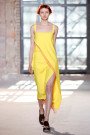 Lak sent out a beautiful wispy silk floral mid-length dress with a twisted cutout detail at the bodice, followed by a cargo pant and tunic version. But it was the Impressionist-printed jacket and matching wrap skirt, adorned by a fur stole worn like a slouchy backpack, that set the tone.