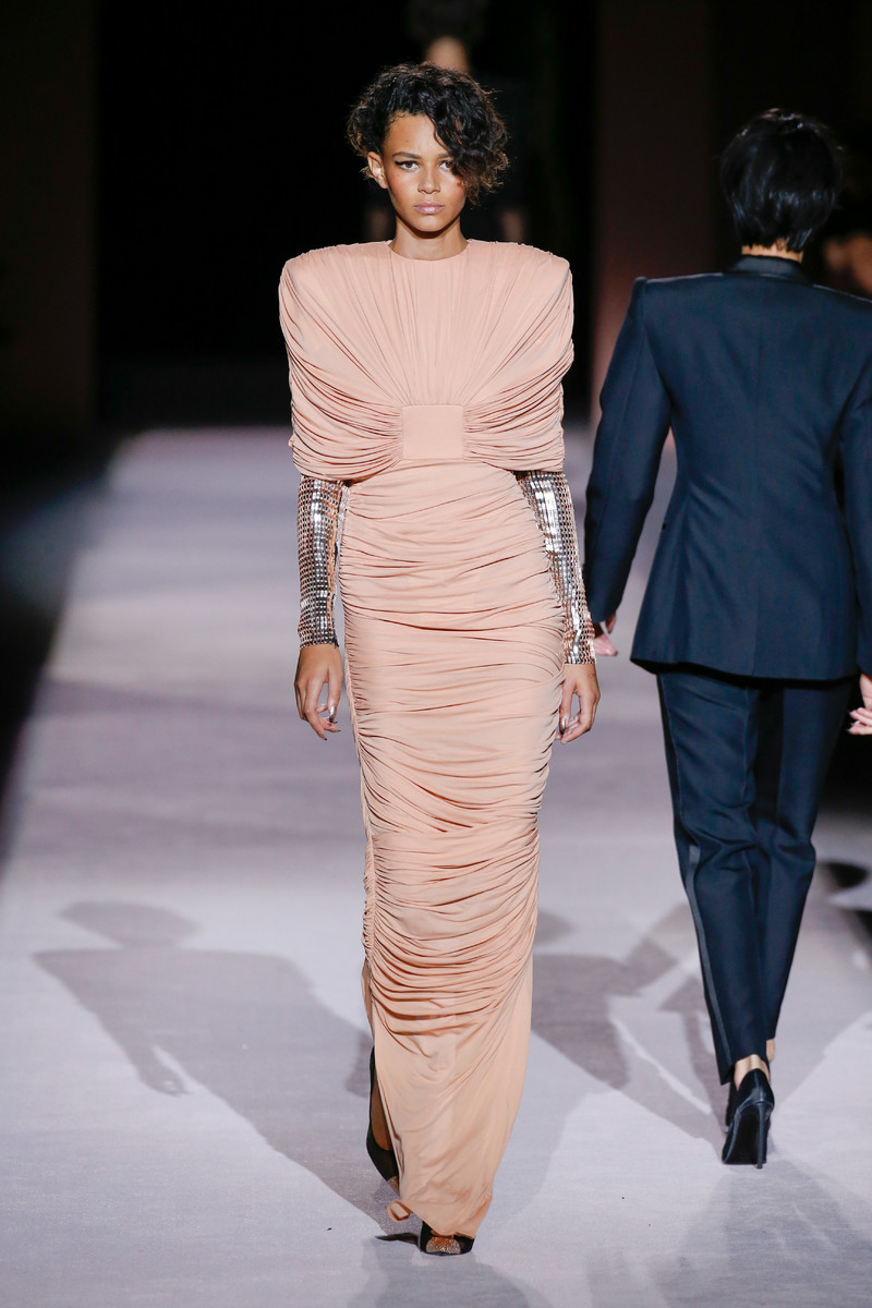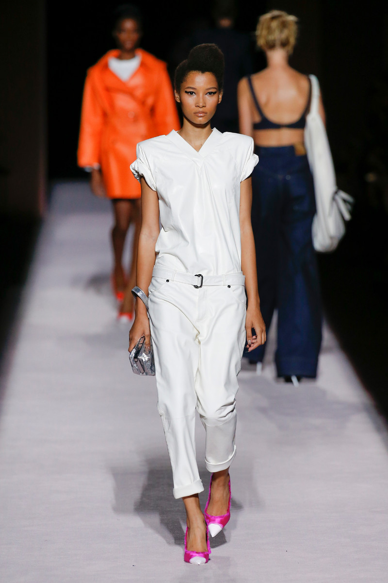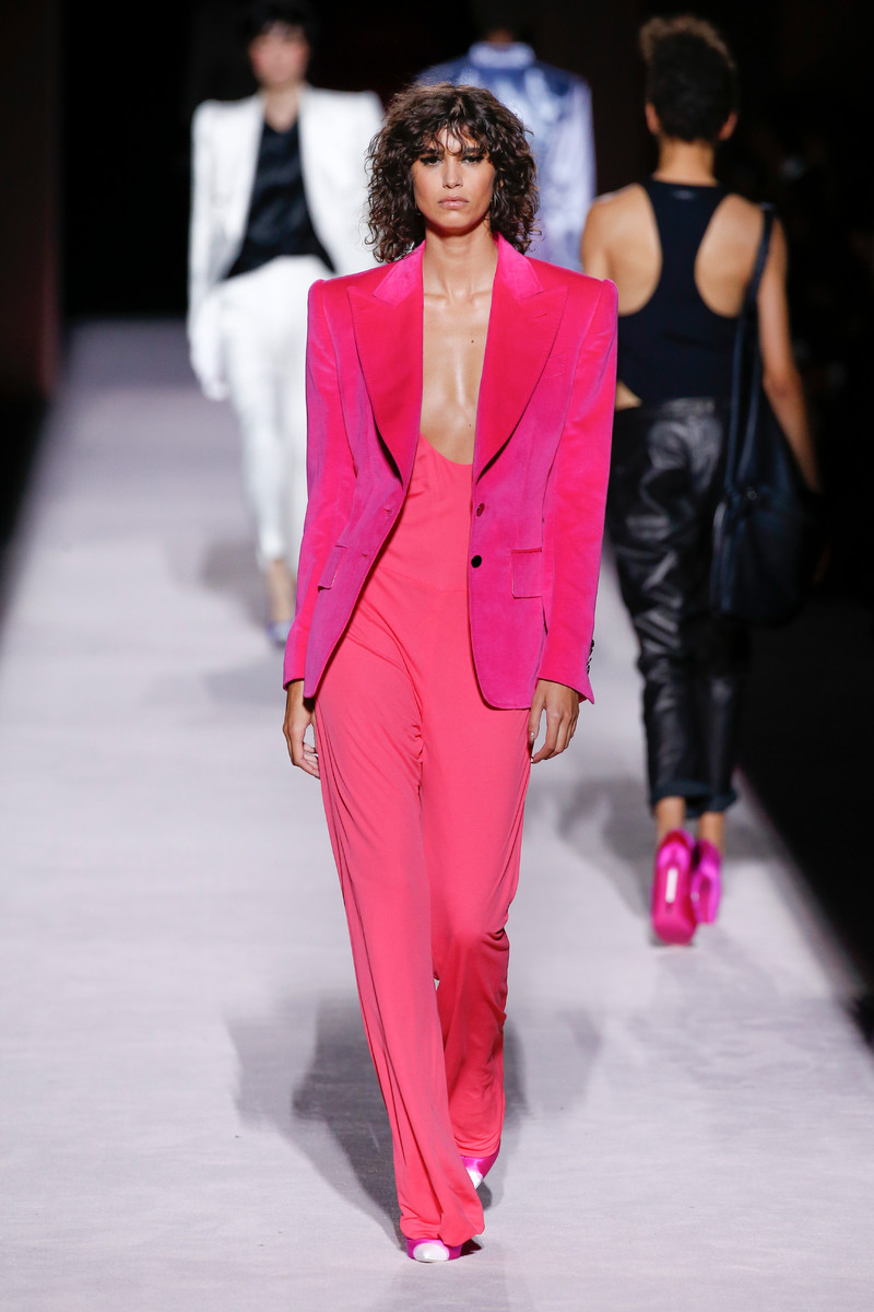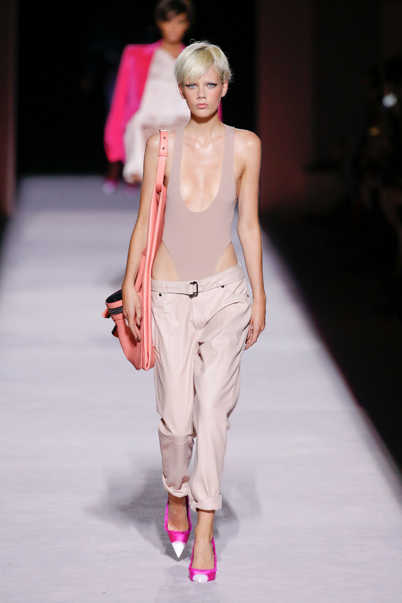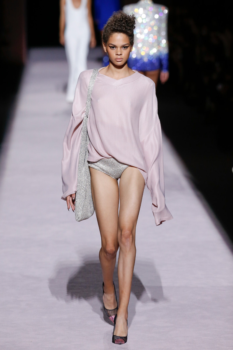 The spring summer collection Tom Ford presented was a classic one: the calculated decadence we know so well from Ford, rendered in a split between athletic-derived sportswear and power-woman goddess gowns. Crossover of athletica into the primary daywear vernacular aside, Ford loves tailored polish. He opened with a bold-shouldered pale pink satin tuxedo jacket over a liquid metallic top and short-shorts, rolled at the hem. Unlike the old Gucci days when he worked the daylights out of a single look, here he offered options, some approachably chic, others challenging to all but the most secure of attitude and body image: classic pantsuits, dressed-up dark denim, short leather trenches and racy jumpsuits. One, a long, backless drink of water in white crepe, rang the bell of a long-ago Gucci dress with a cutout abdomen. An infusion of wit came in an only Tom take on the twinset: slouchy chain mail shoulder bag and matching briefs worn with a louche pale pink top. As for the eveningwear, strong shoulders and sequined sleeves transported classic draping from ethereal to aggressive, as glam as it gets.