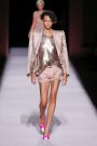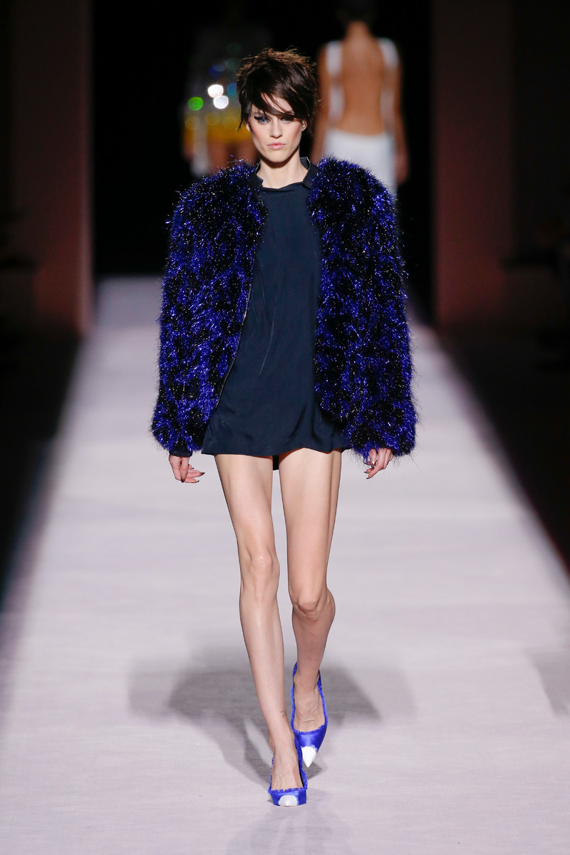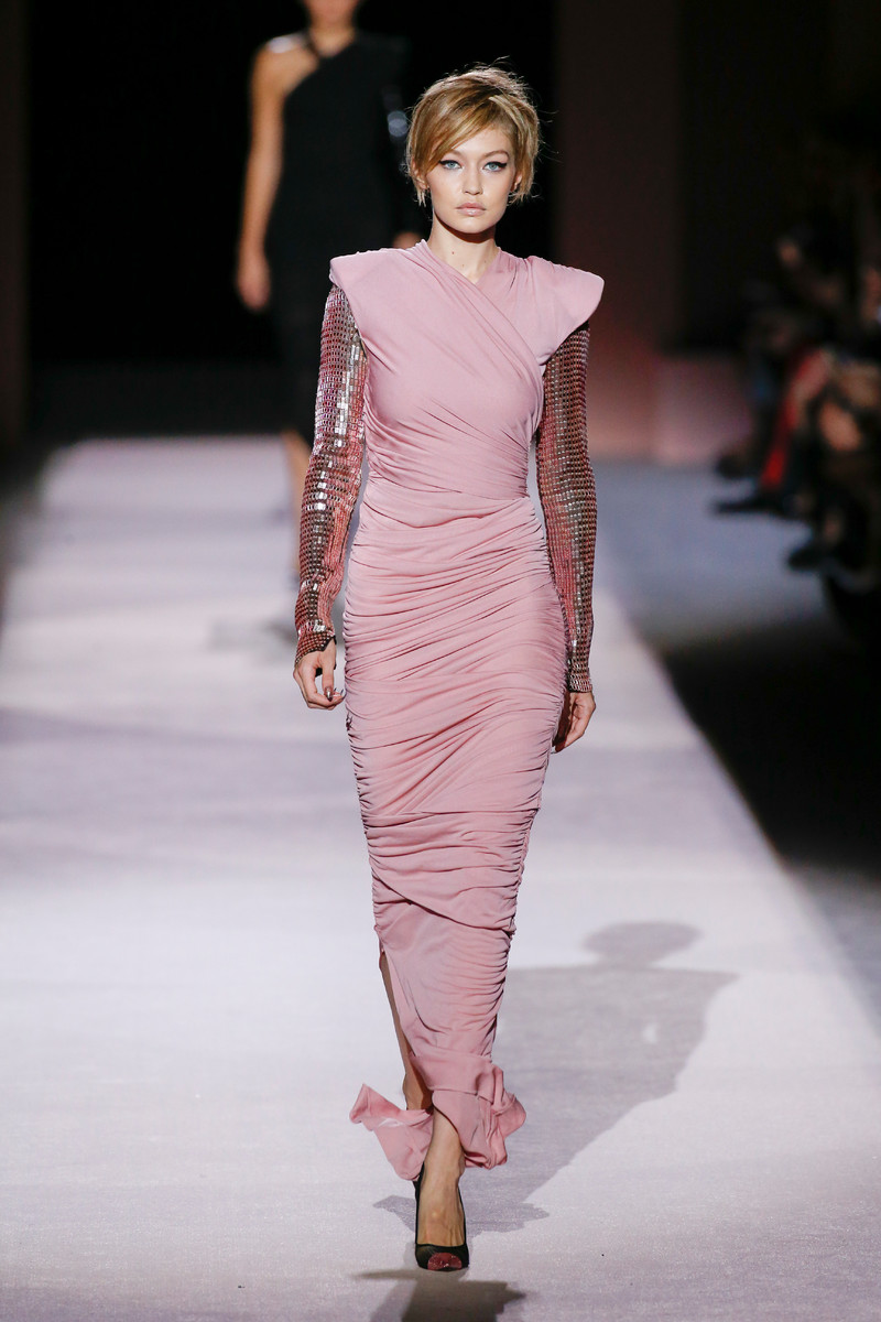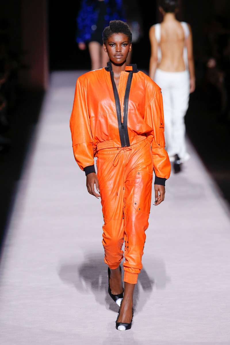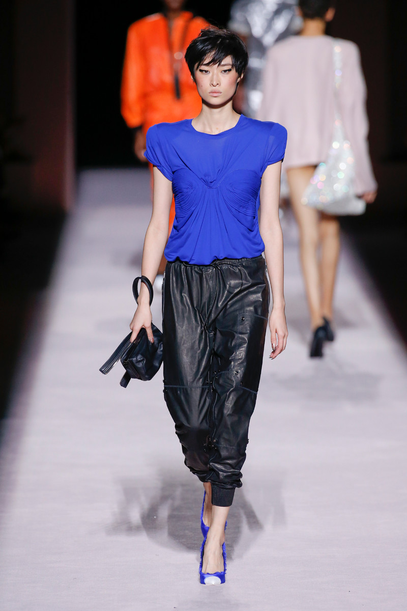 The spring summer collection Tom Ford presented was a classic one: the calculated decadence we know so well from Ford, rendered in a split between athletic-derived sportswear and power-woman goddess gowns. Crossover of athletica into the primary daywear vernacular aside, Ford loves tailored polish. He opened with a bold-shouldered pale pink satin tuxedo jacket over a liquid metallic top and short-shorts, rolled at the hem. Unlike the old Gucci days when he worked the daylights out of a single look, here he offered options, some approachably chic, others challenging to all but the most secure of attitude and body image: classic pantsuits, dressed-up dark denim, short leather trenches and racy jumpsuits. One, a long, backless drink of water in white crepe, rang the bell of a long-ago Gucci dress with a cutout abdomen. An infusion of wit came in an only Tom take on the twinset: slouchy chain mail shoulder bag and matching briefs worn with a louche pale pink top. As for the eveningwear, strong shoulders and sequined sleeves transported classic draping from ethereal to aggressive, as glam as it gets.