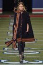 He staged the show at the Park Avenue Armory, which was transformed into a football stadium, with a Jumbotron capturing the fashion plays as models walked the runway in Ali MacGraw-inspired ’70s-prep silhouettes. They were wearing faux-fur stadium jackets with red-stitched toggles, wool cashmere ponchos, and several looks in bouclĂ© plaid. The jacket of a shorts suit, for instance, was decorated with a knitted striped collar. Those athletic stripes added a sporty detail to just about every item, many of which were decorated with little pins and stars reminiscent of 1940s football paraphernalia.