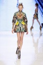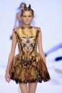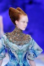 Inspiriation for this dazzling collection came from Darwin, the natural world, underwater aliens and technology. In a pressrelease the designer explained he was casting an apocalyptic forecast of the future ecological meltdwon of the world. We may be heading back to an underwater future as the ice cap dissolves. McQueens fantasy goes beyond borders . The dresses were molded and shaped, had engineered (reptile)prints and jacquards and came in breathtaking whorls of colors (greens, browns, aqua and blue). The platform-shoes were alienating. In a section in which it looked as if McQueen was envisaging a biological hybridization of women with sea mammals, there were trousers whose bulbous flanks mimicked the skin of sharks or dolphins. Some dresses and tops looked like large bubbles of water.