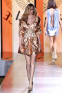 This haute couture show was as Versace as Versace can be: the pastel chain mail, the hip-high slits, the scarf prints, the Medusa emblems, the bared skin. For colors, Versace favored nudes and jewel tones that matched the cocktail rings made from yellow diamonds, emeralds, and topazes the models wore on both index fingers. Short corseted dresses made from tarot-card-print silk laminated with PVC were  cut into narrow lengths; bits of flesh were visible through the slits.  Slashes on beaded evening dresses were sutured together with strands of crystals; another dress was patched together with silk chiffon lacing from pieces of leather that were hand-cut with tiny circles and hexagons.