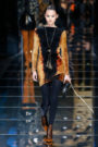 Next fall the glamazons of Balmain will be dressed in raw pelts with a stitched-together feel. One of the models looked particularly fierce in a black dress assembled from crocodile skins, a tribal-looking metallic lip ring tracing a gleaming line across her mouth. Other options included a shearling sleeveless coat, or a tunic top pieced together from panels of glossy ponyskin. “It’s all about a return to the forces of nature. I wanted to create strong Amazons. Women’s power today is extremely important, and I think I reflect that with this collection. It’s very feminist,” Olivier Rousteing told WWD backstage.
