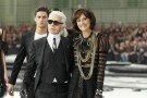 All of Karl’s muses were at the show in the Grand Palais on Tuesday. Claudia Schiffer, Lilly Allen, Vanessa Paradis and Alexa Chung. Besides one of Karl’s former male muses, Brad Koening walked in the show with his little son, both in matching Chanel outfits. Also, there were three generations of models walking the show. Karl: ‘Inez is model of the 80s, Stella is the model of the 90s , Freja is the model of today’.