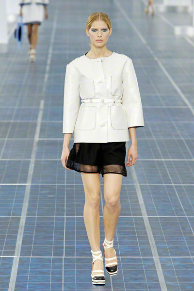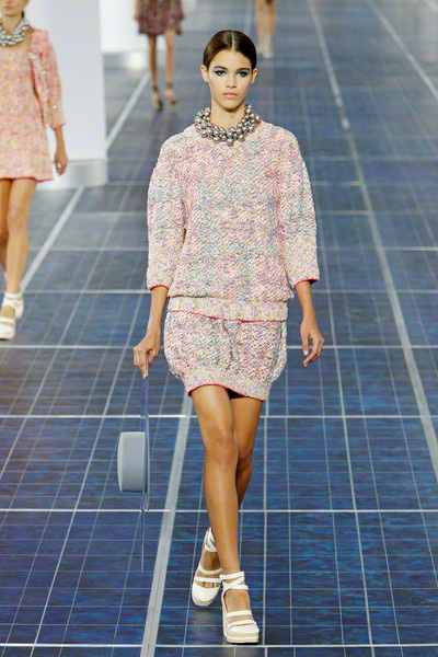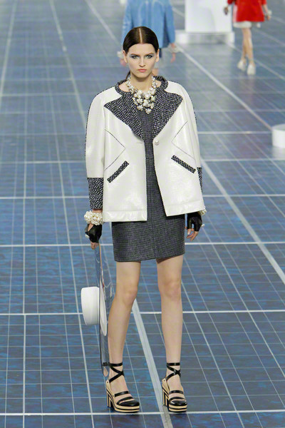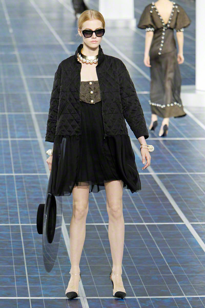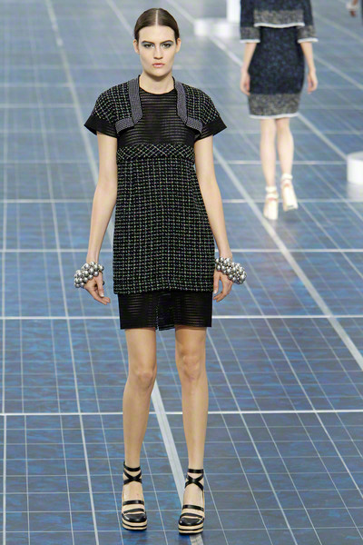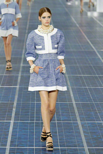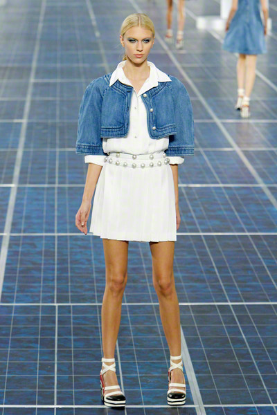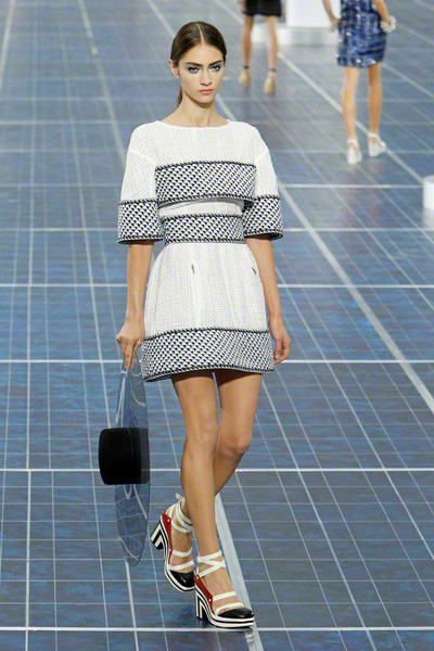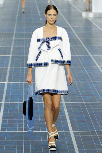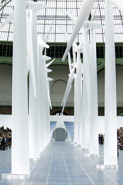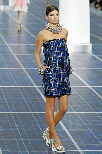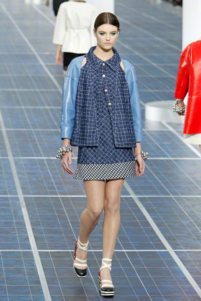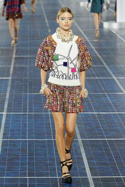 He did a very non sustainable thing a few seasons ago by shipping that ginormous iceberg to Paris, yet Lagerfeld is fully focused on sustainability now. At least, so it seemed at Chanel’s SS2013 show at the Grand Palais. Fake windmills and a catwalk painted with the image of solar panels formed the backdrop for the collection presentation.