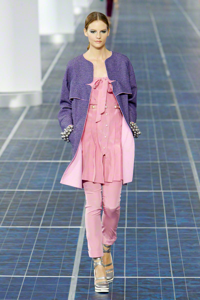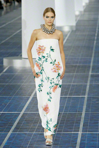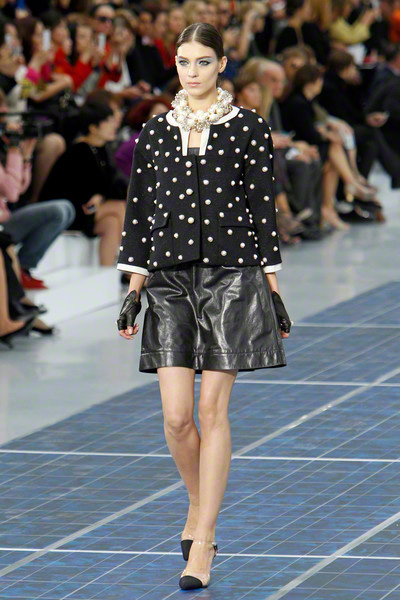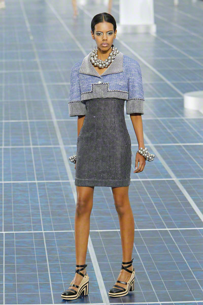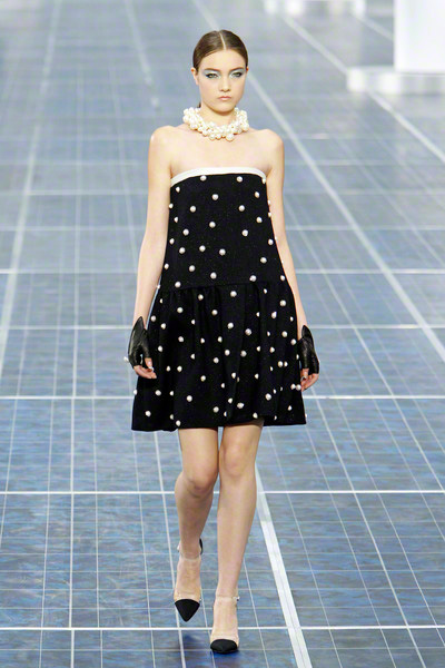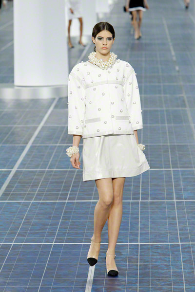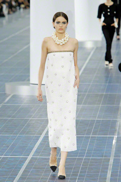 Chanel’s image for spring started off with classic looks; skirt suits and strapless dresses decorated with pearls. Pearls that kept popping up throughout the entire show. A show filled with renewed loose fitting Chanel suits.