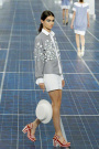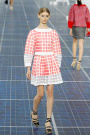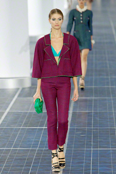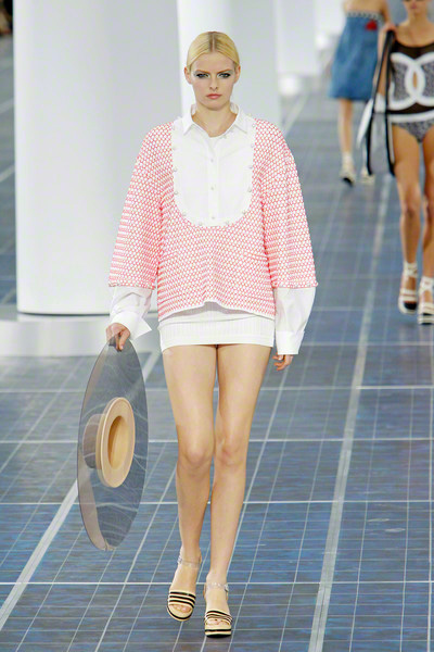 Tweed fabrics, the usual suspects at Chanel, were done in bright, almost fluorescent shades, which added a young touch to the collection. Plexi glass hats to match. Mesh, patent leather and even denim made up for some unexpected creations. A sheer CC bathing suit was given a little more ‘body’ by an enormous Chanel beach bag, which had straps as large as hula hoops.