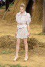 As soon as the audience noticed the stage at Chanel – a barn and a haysteck were Lily Allen performed – it knew what the Chanel-show would be about. Ultrachique farmergirls in playful dresses, swirling skirts and tough jeans wearing Chanel-clogs and scarves around their head. Colors were classic-Chanel: white, marine, red and pastelshades of pink. The famous Chanel tweed was woven as there were little pieces of hay sticking out, the jeans looked old and repaired, some dresses seemed handknitted. This was a very cheerful Chanel-collection, young and upbeat and far away from the classic two-piece suit.